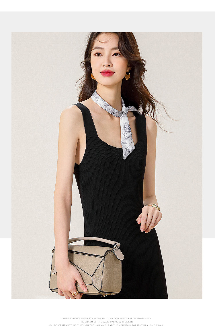 【优雅淑女】简约百搭纯色方领收腰中长款无袖吊带针织连衣裙 141011