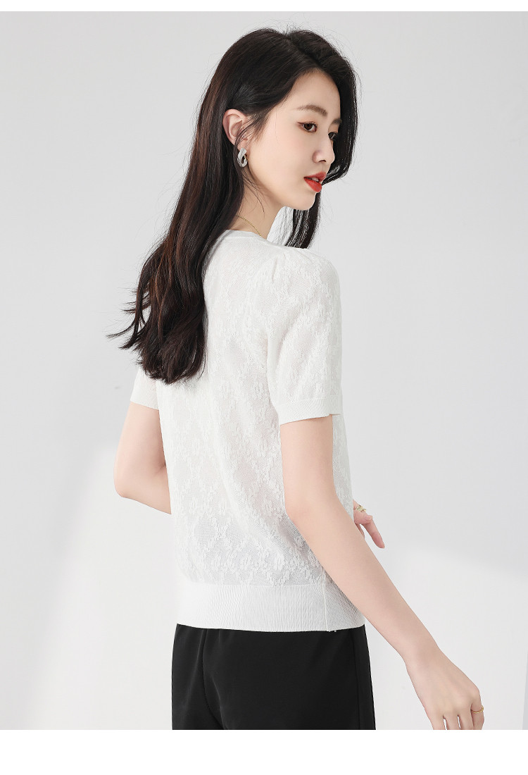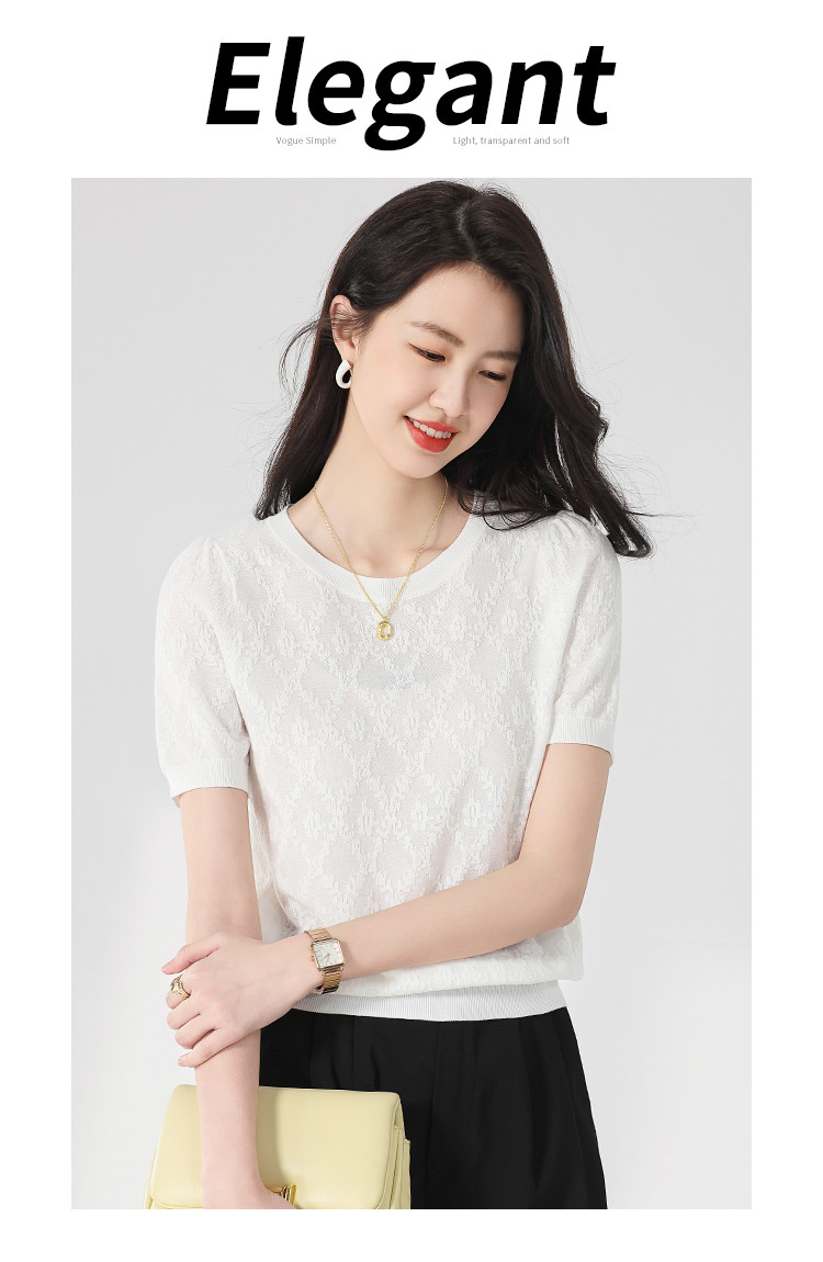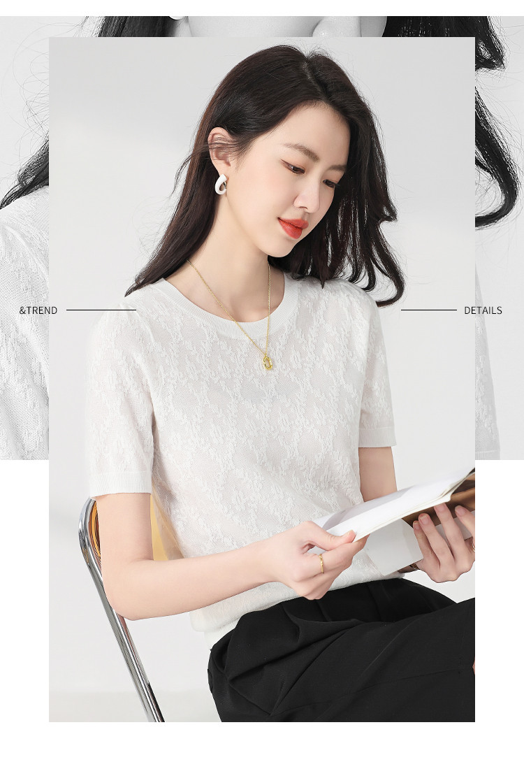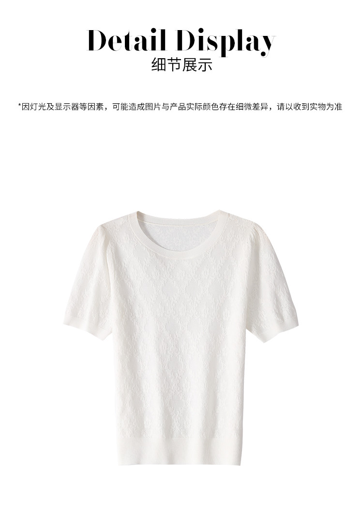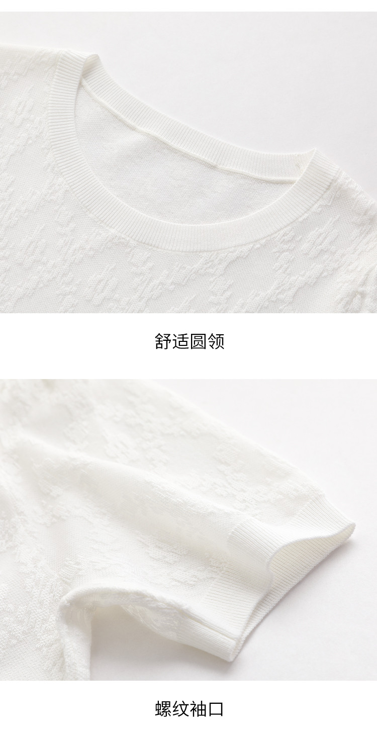 商品名称:轻薄纯色圆领提花含桑蚕丝针织打底短袖T恤针织衫女夏 900563