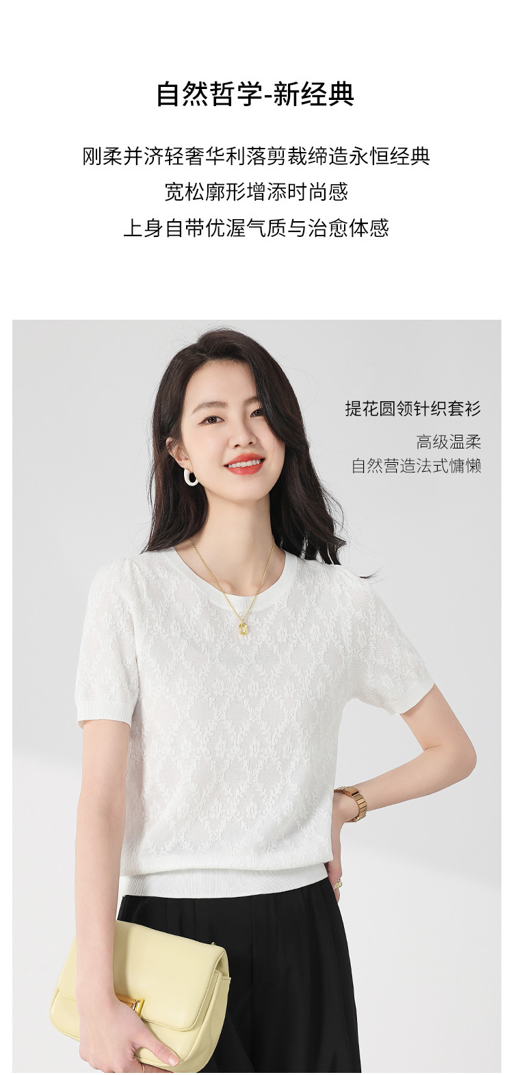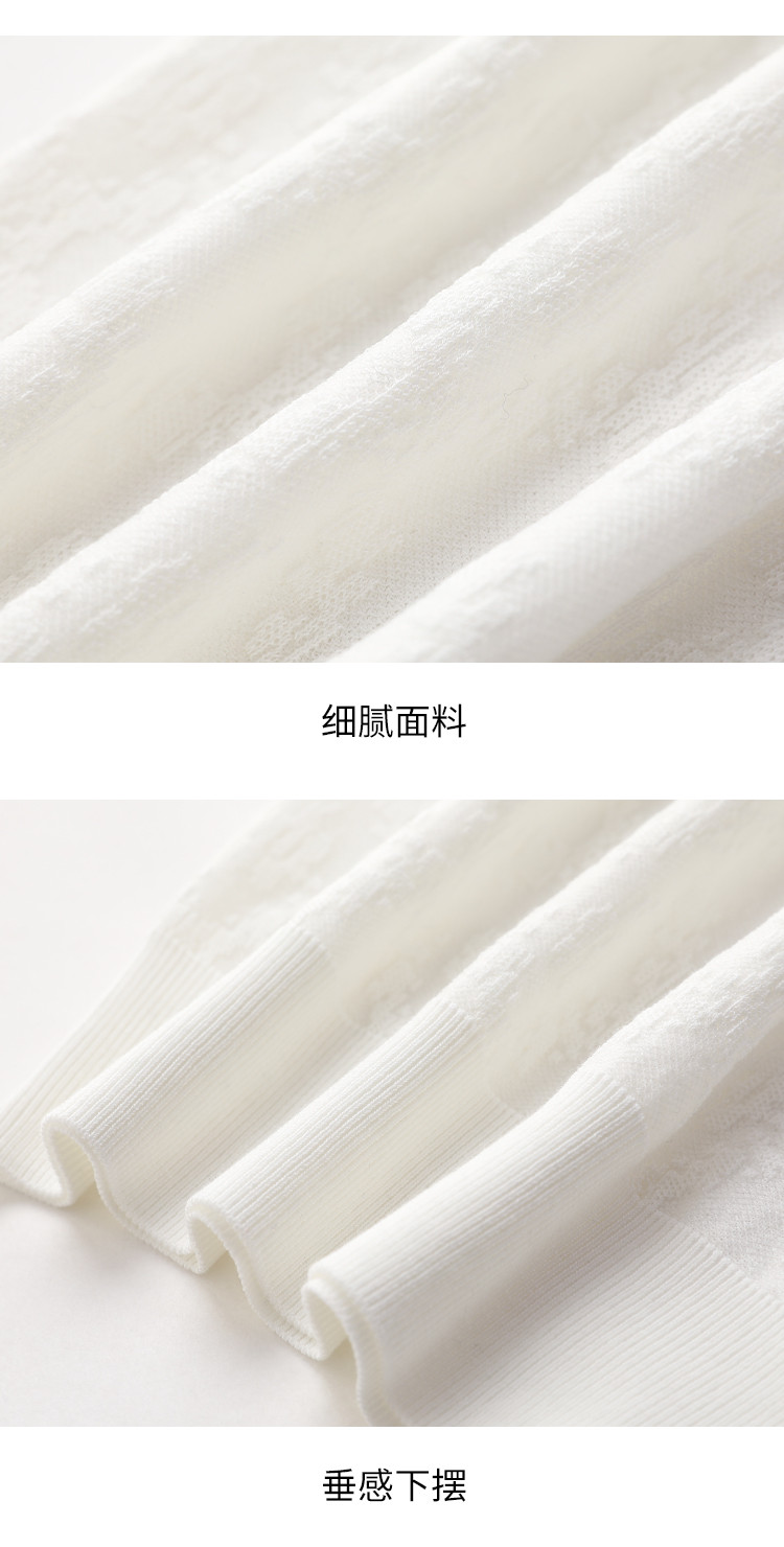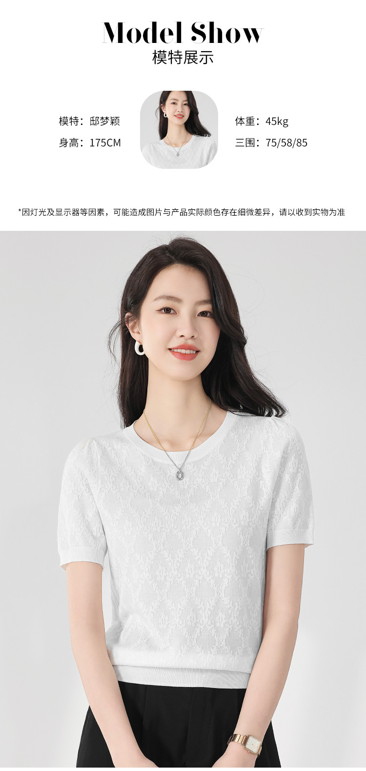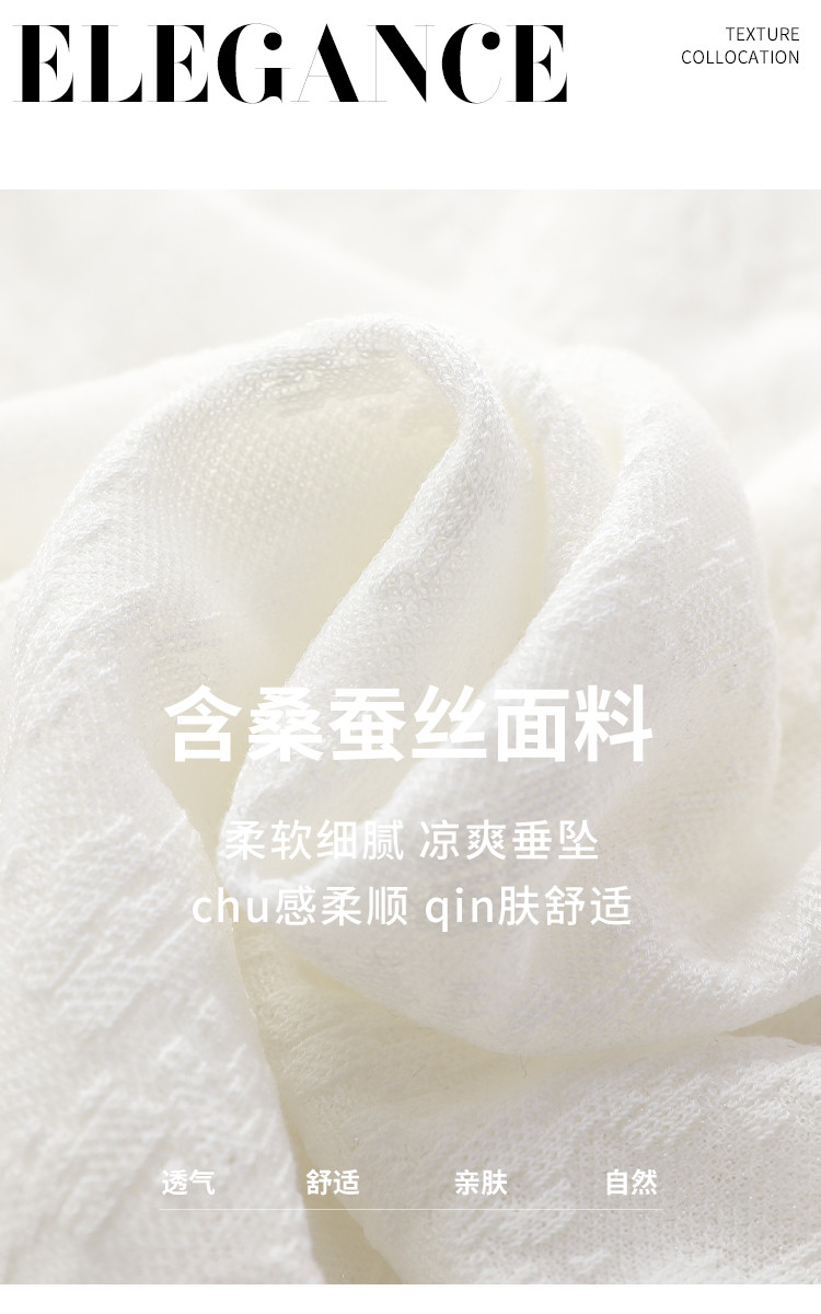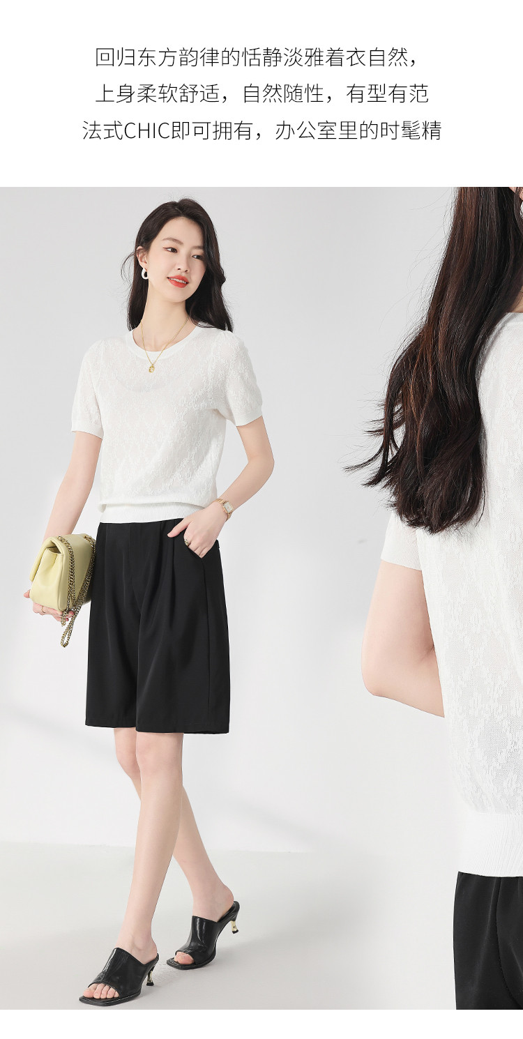 商品名称:轻薄纯色圆领提花含桑蚕丝针织打底短袖T恤针织衫女夏 900563