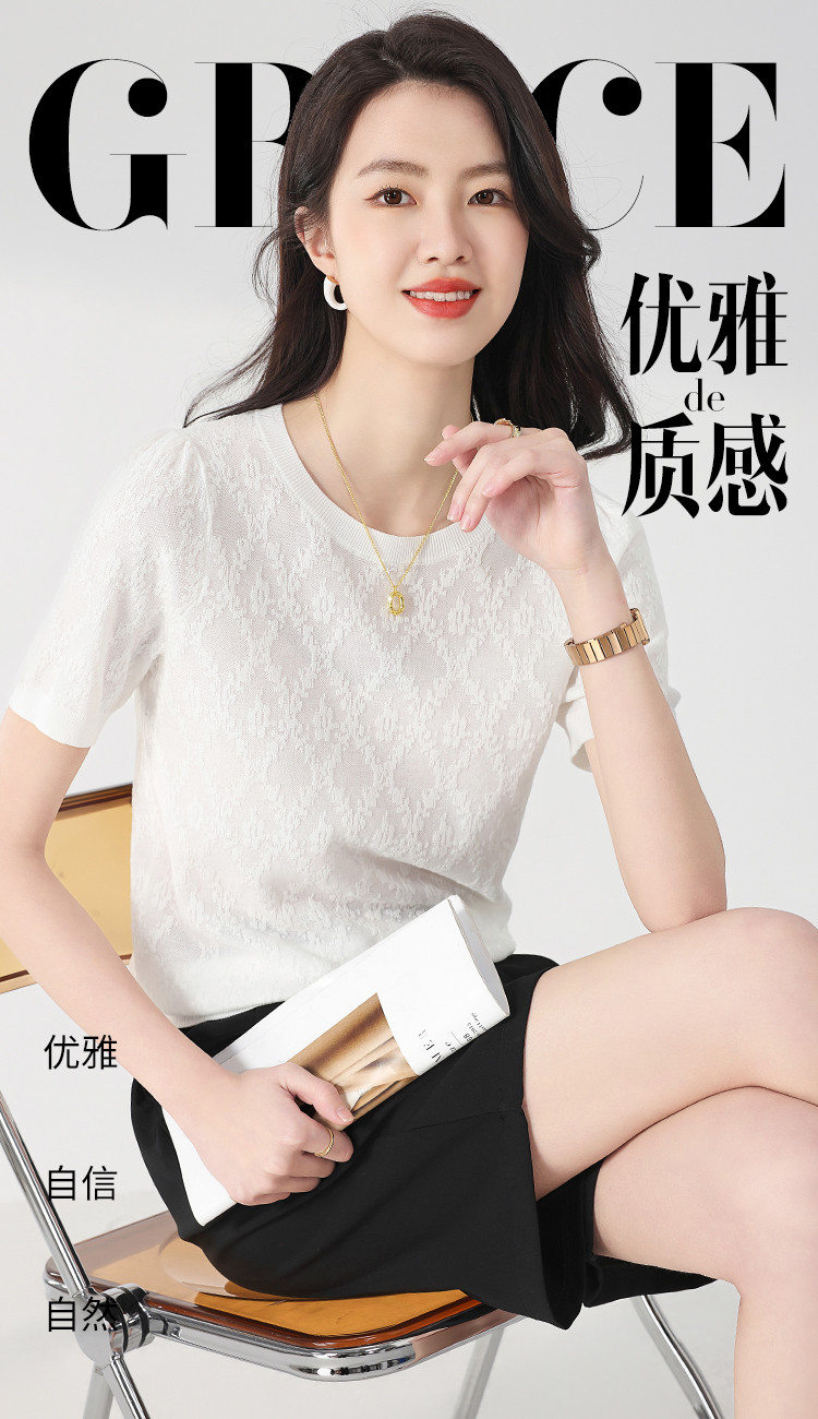 轻薄纯色圆领提花含桑蚕丝针织打底短袖T恤针织衫女夏 900563