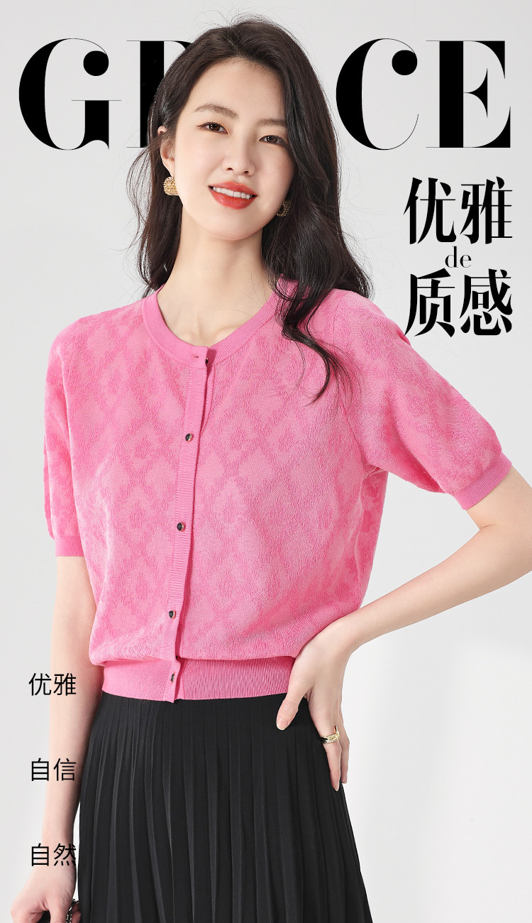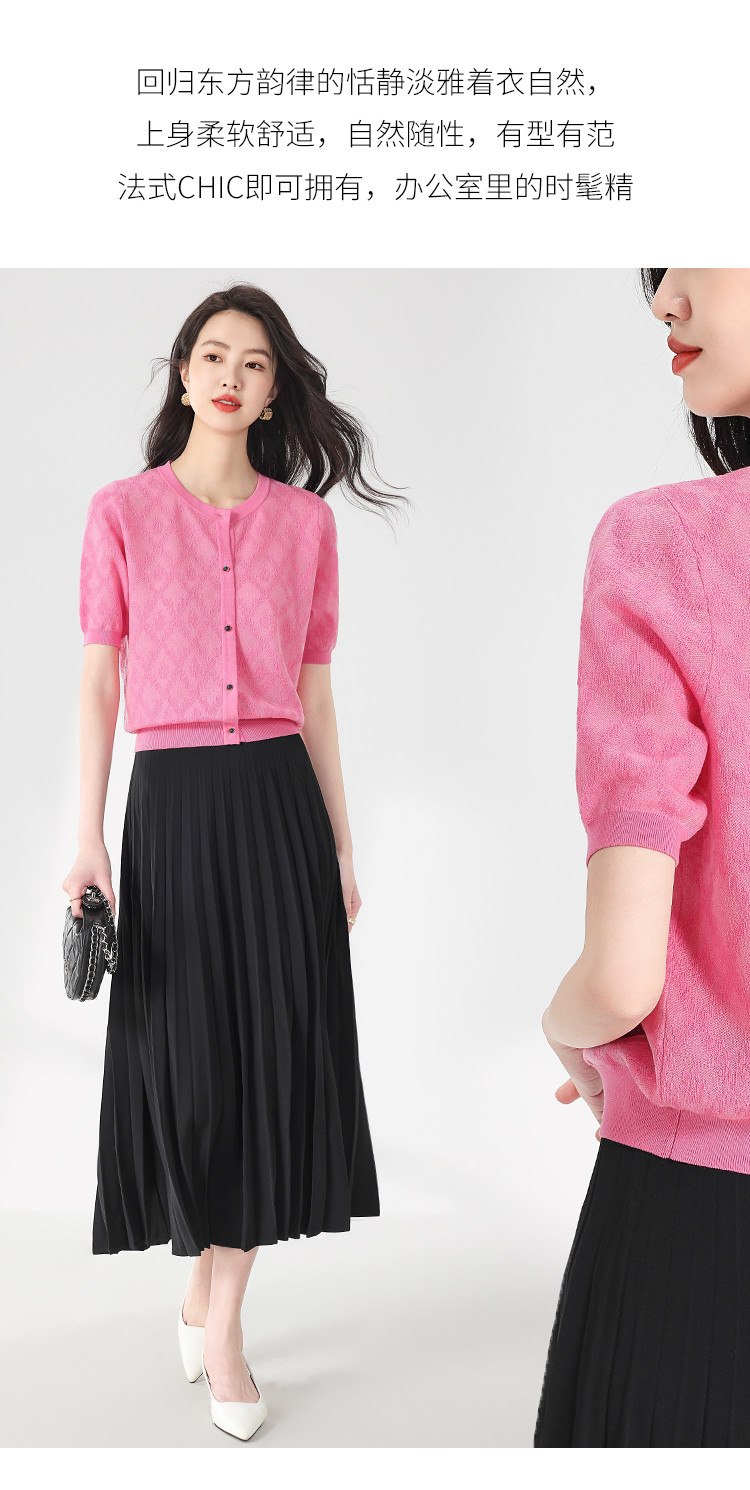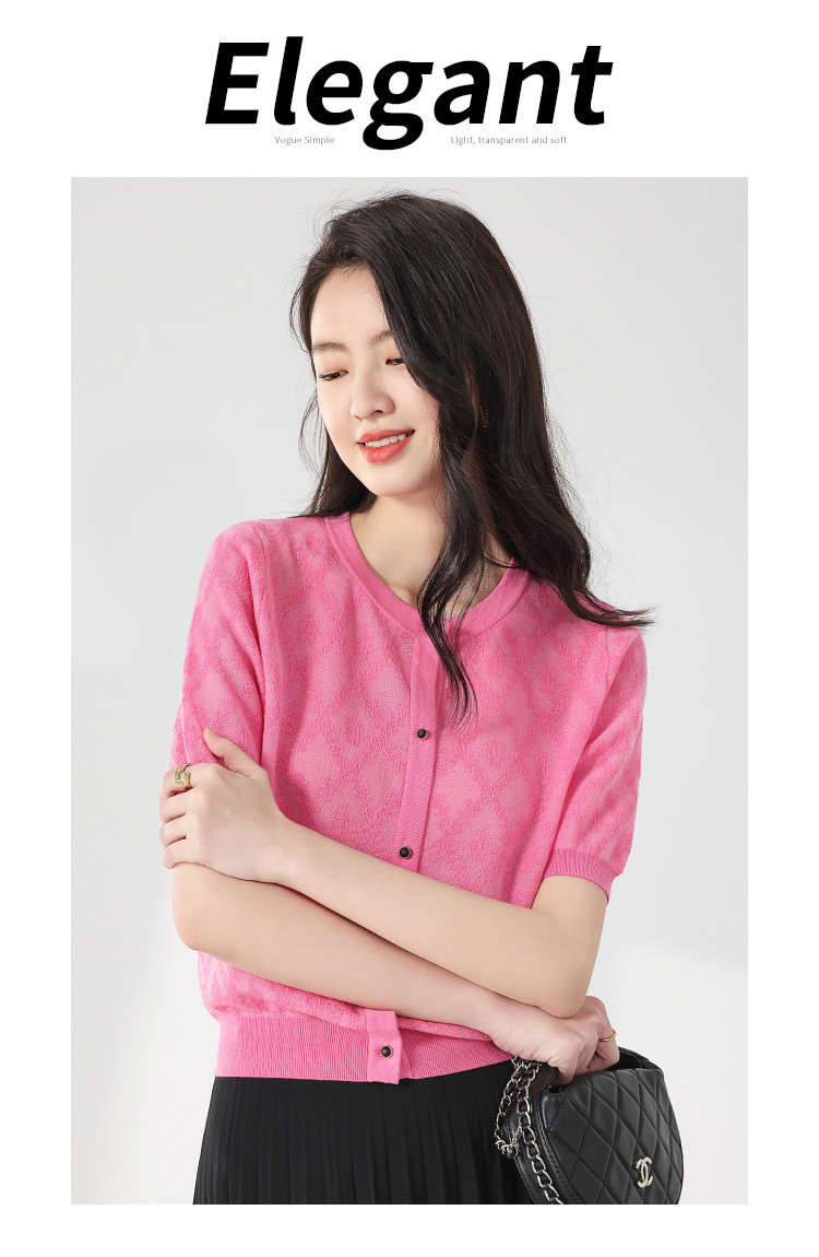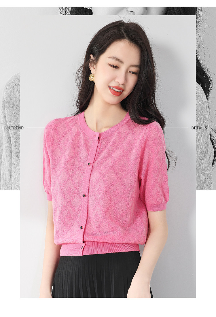 商品名称:轻薄纯色提花含桑蚕丝针织衫女开衫打底短袖T恤空调衫小外套夏 456019