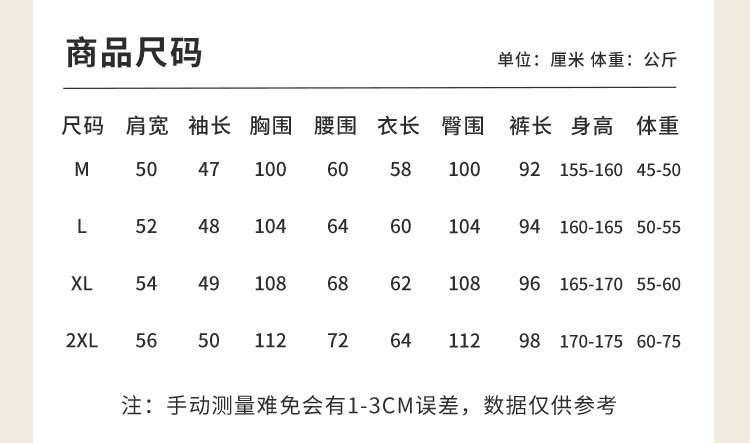| 尺码 | 肩宽(cm) | 袖长(cm) | 上装号型 | 下装号型 | 衣长(cm) | 身高(cm) | 腰围(cm) | 裤长(cm) | 体重(kg) | 臀围(cm) | 胸围(cm) | 号型 |