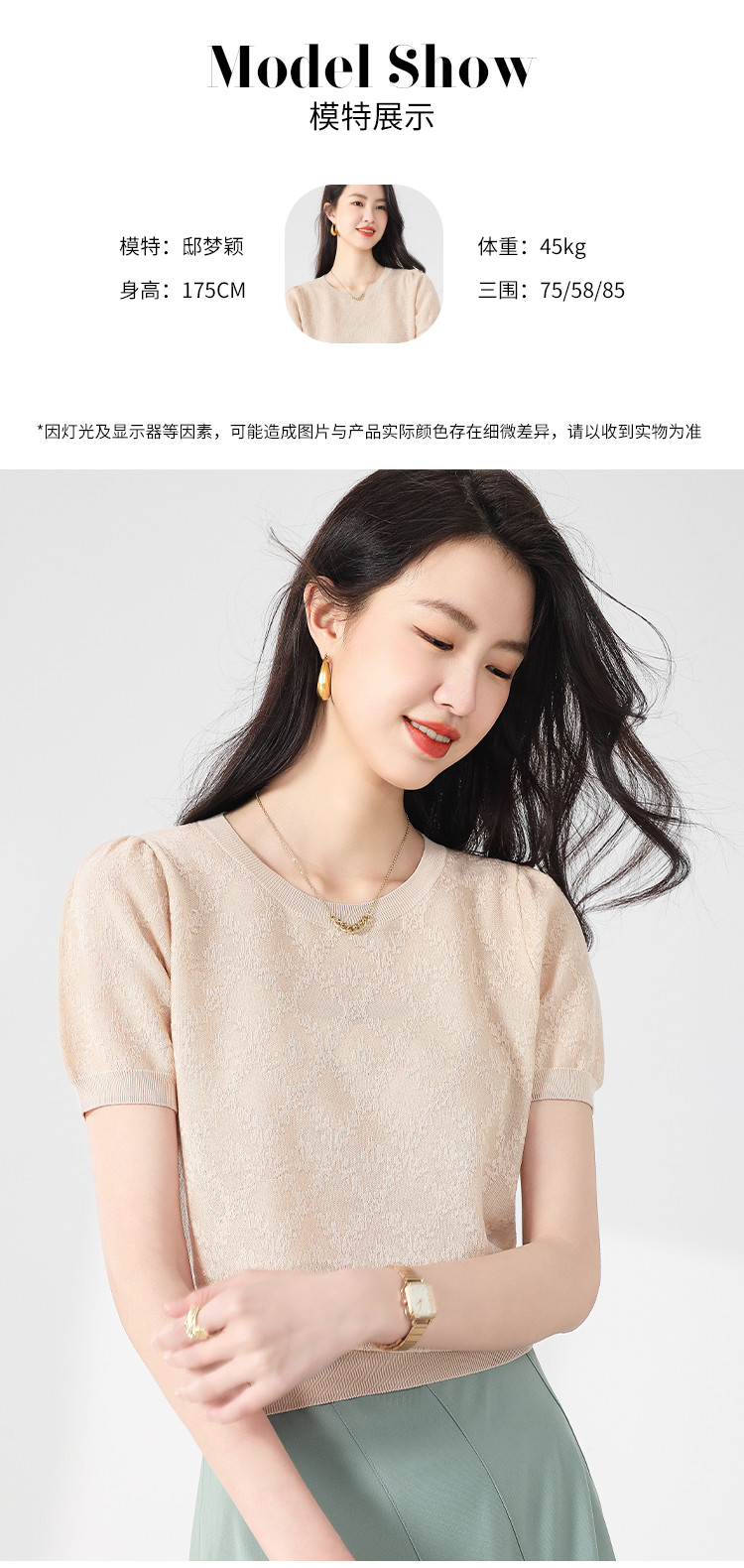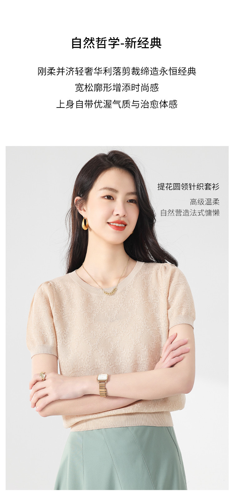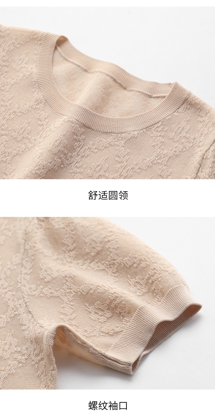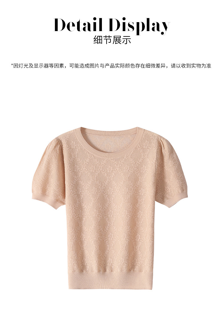 商品名称:轻薄纯色圆领提花含桑蚕丝针织打底短袖T恤针织衫女夏 882579
