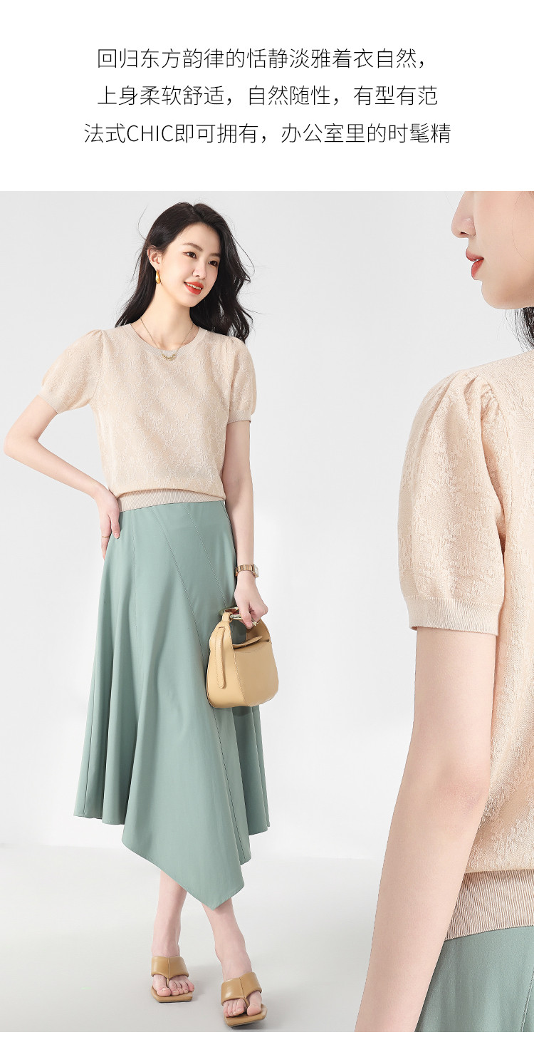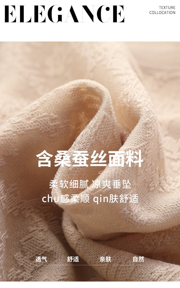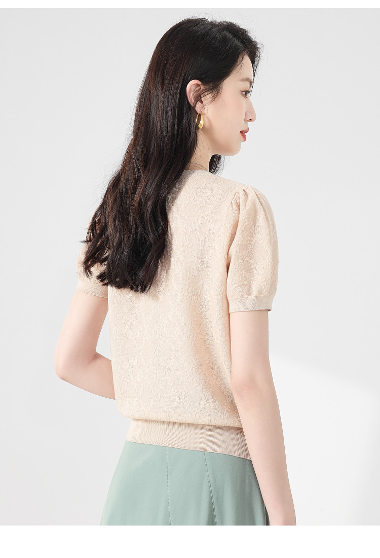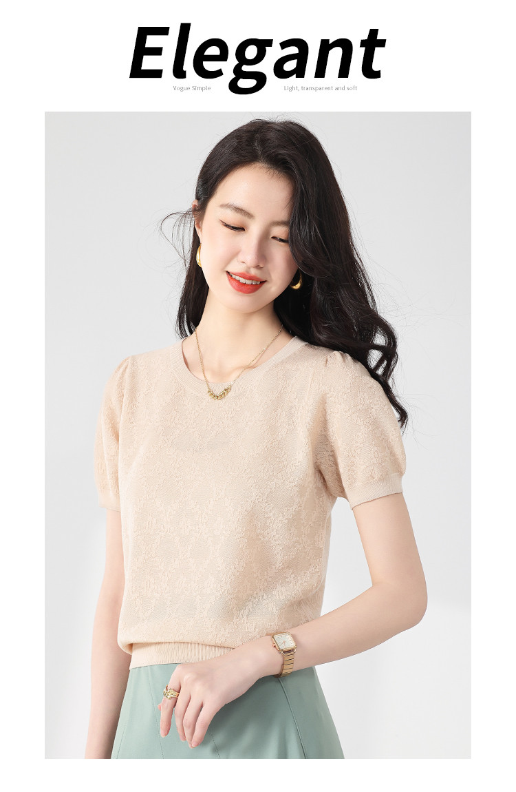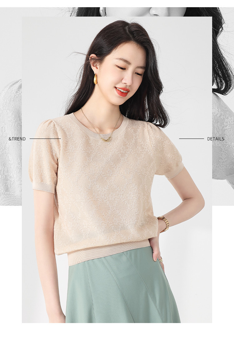 商品名称:轻薄纯色圆领提花含桑蚕丝针织打底短袖T恤针织衫女夏 882579