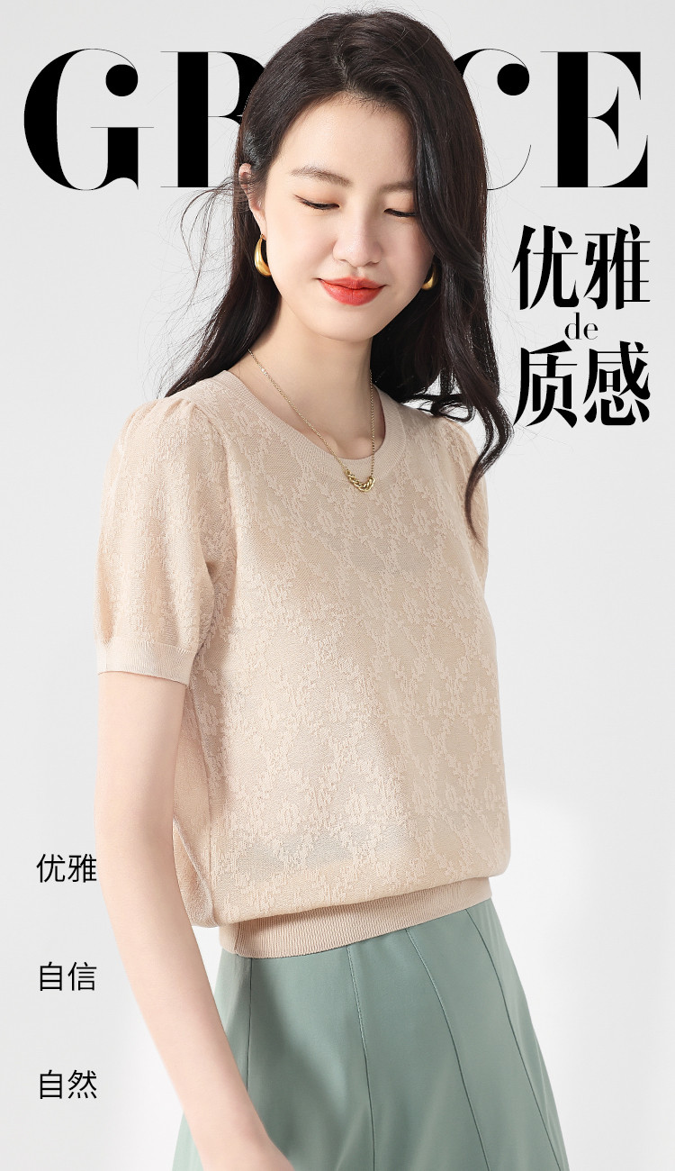 轻薄纯色圆领提花含桑蚕丝针织打底短袖T恤针织衫女夏 882579