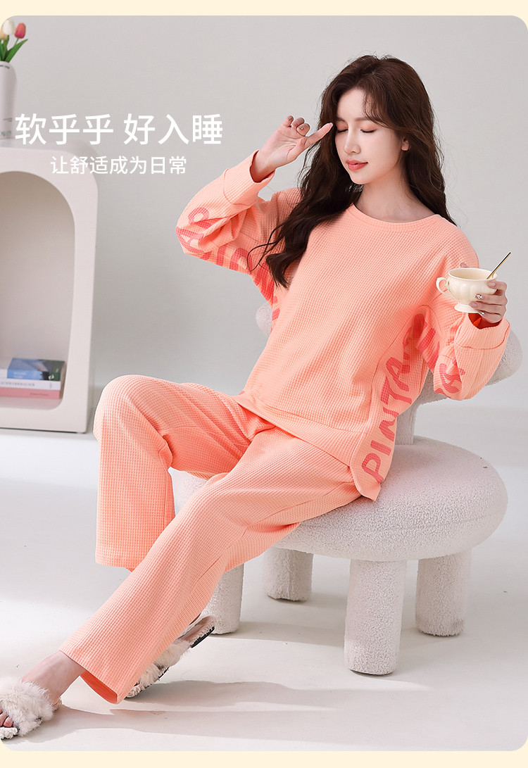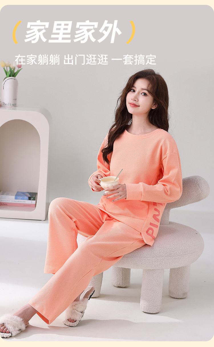 【100%棉圆领华夫格】纯棉女睡衣春秋季可外穿长袖家居服套装 308491