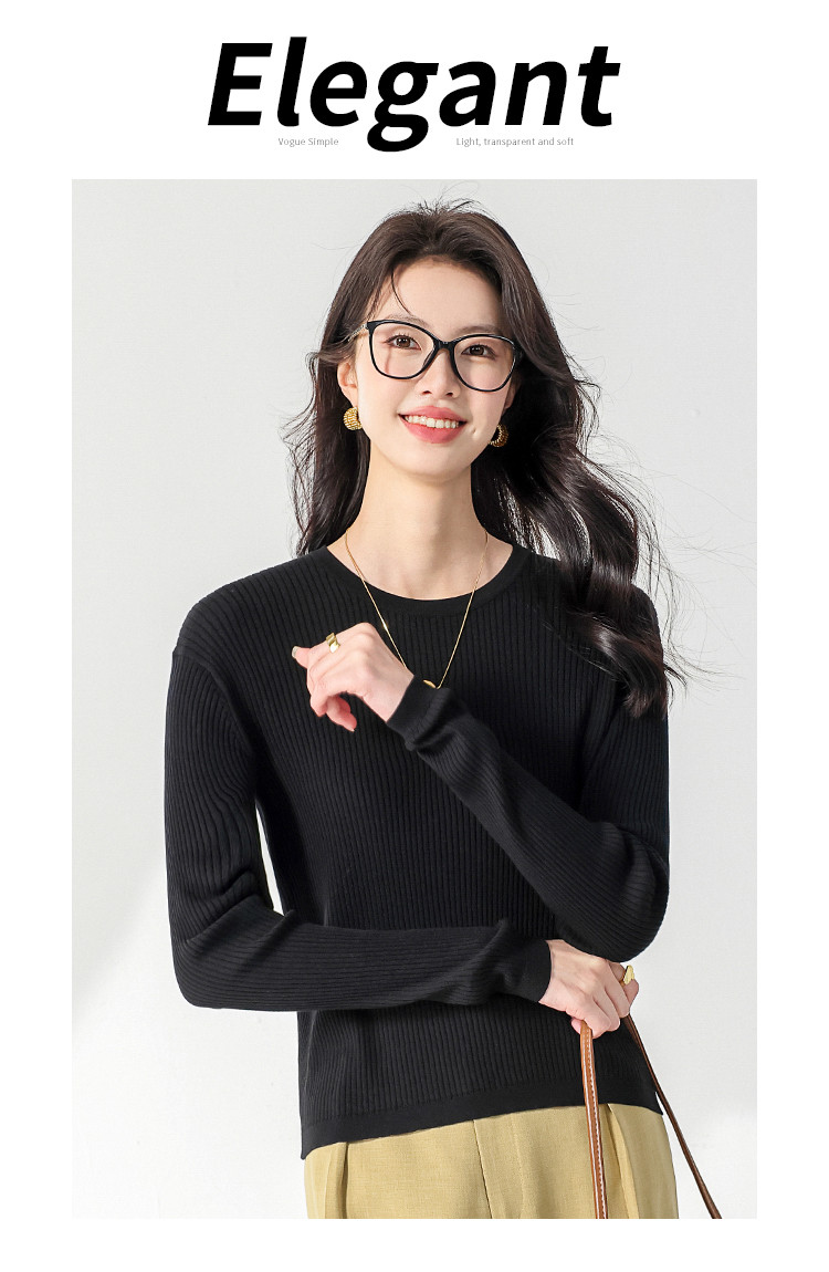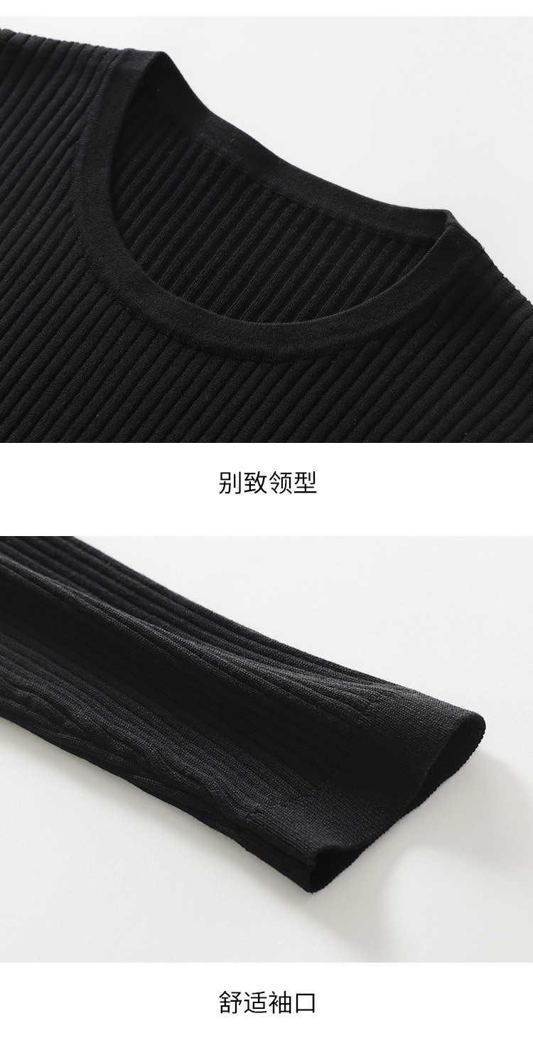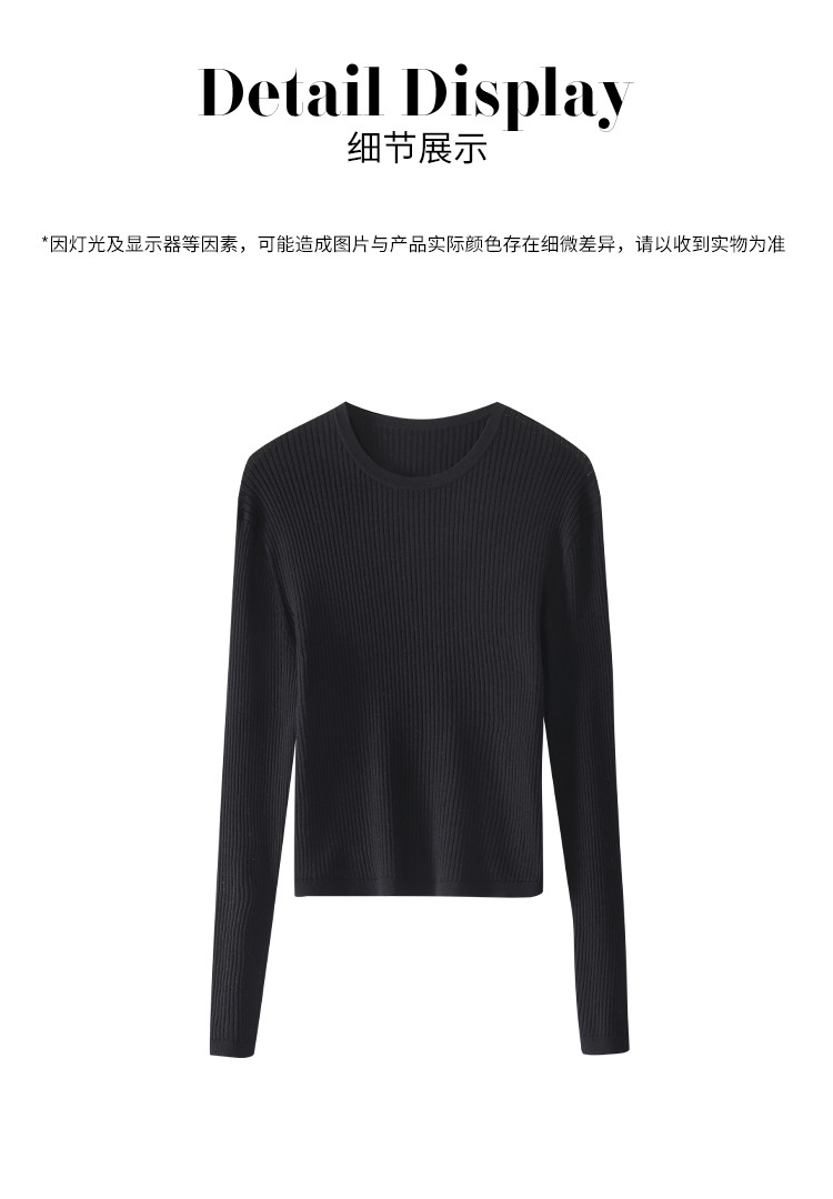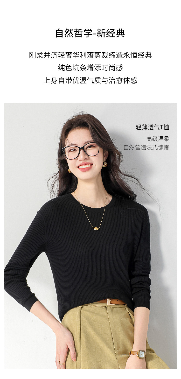 商品名称:春款轻薄透气含桑蚕丝纯色坑条圆领基础针织打底衫长袖T恤针织衫 046483