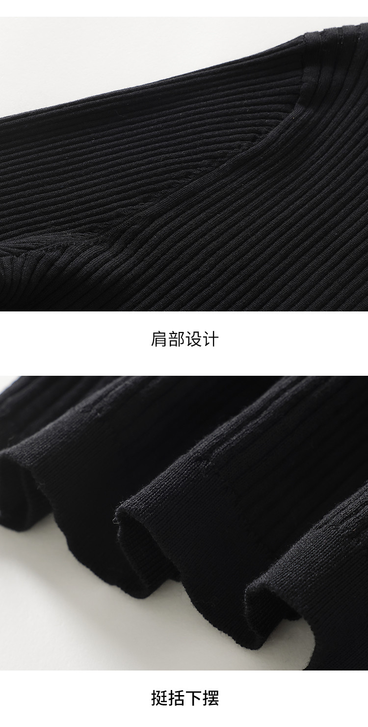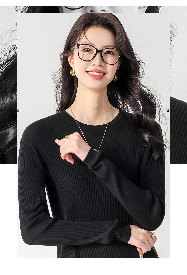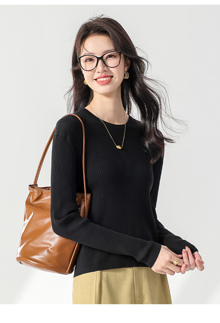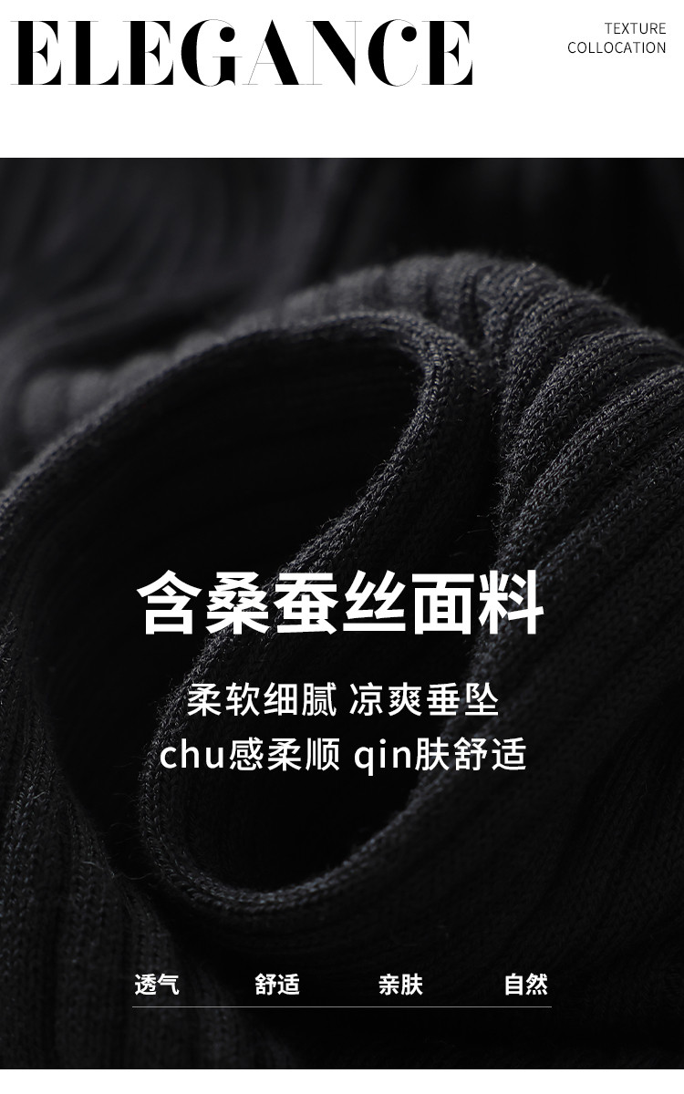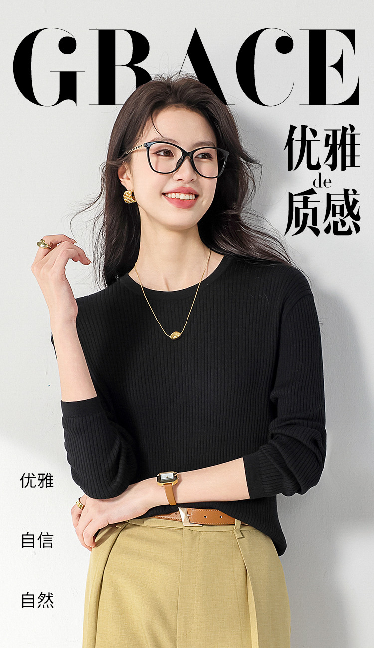 商品名称:春款轻薄透气含桑蚕丝纯色坑条圆领基础针织打底衫长袖T恤针织衫 046483