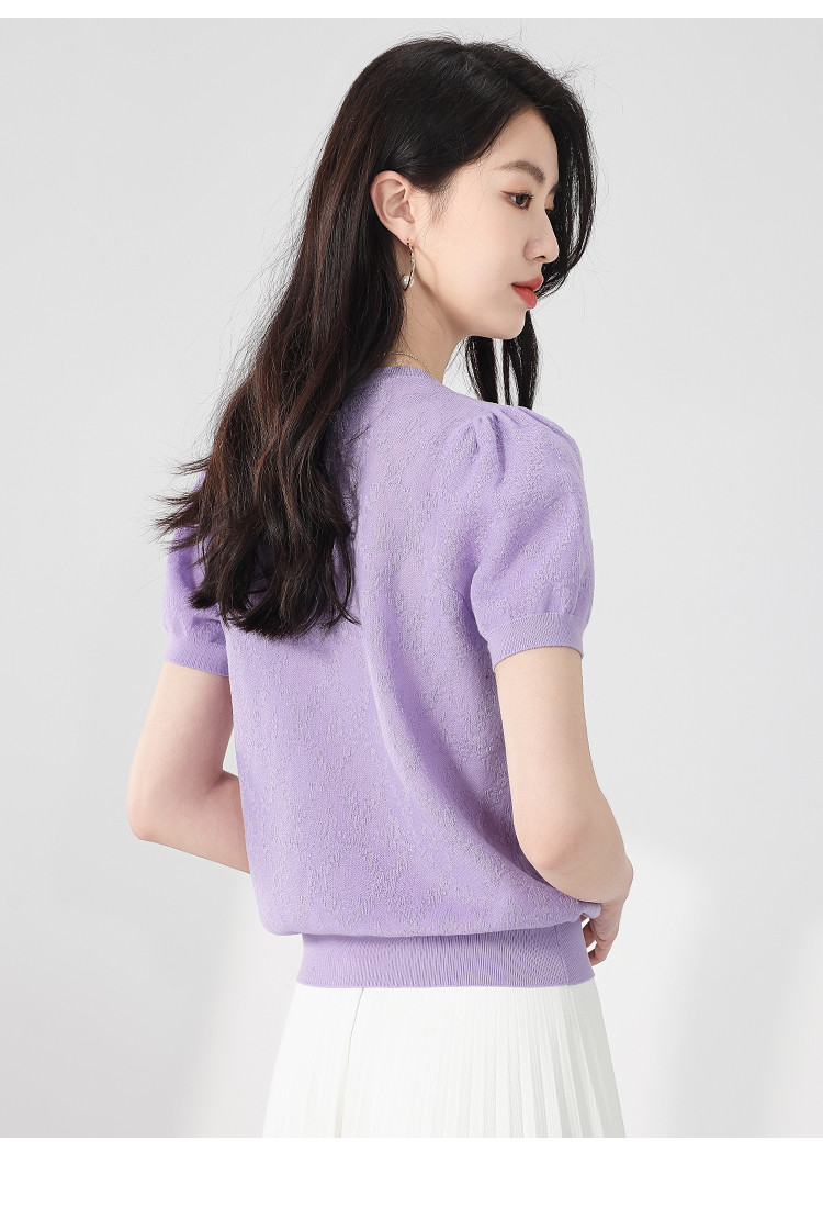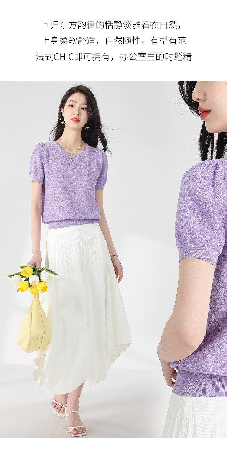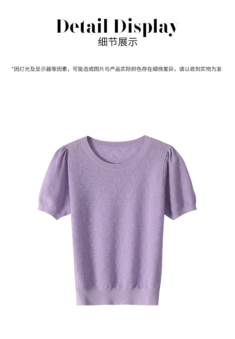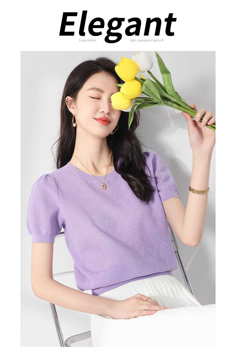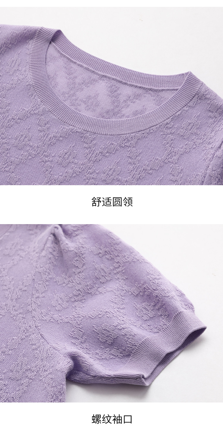 商品名称:轻薄纯色圆领提花含桑蚕丝针织打底短袖T恤针织衫女夏 140627