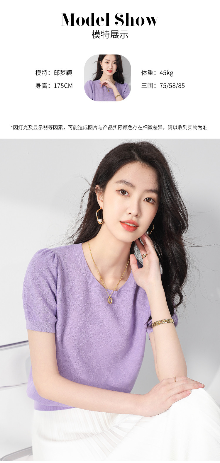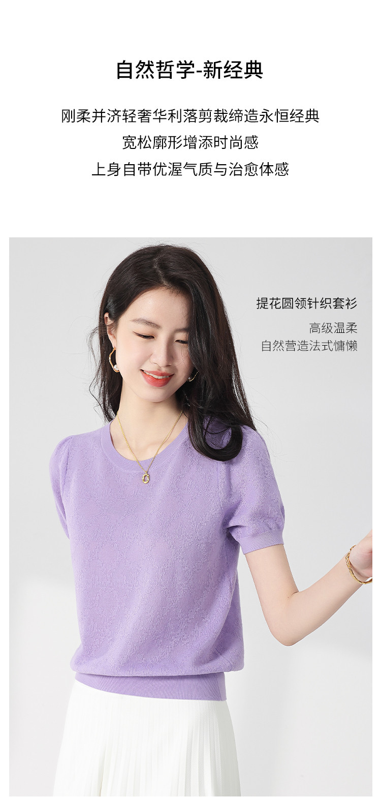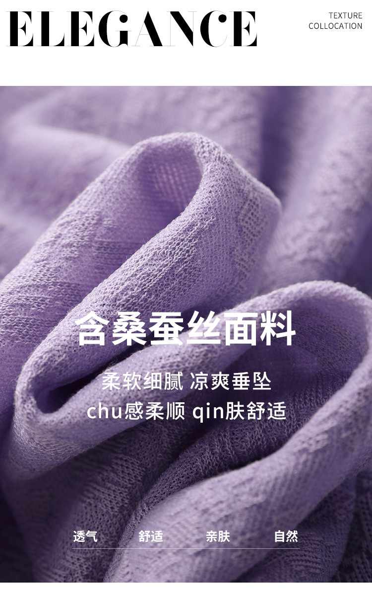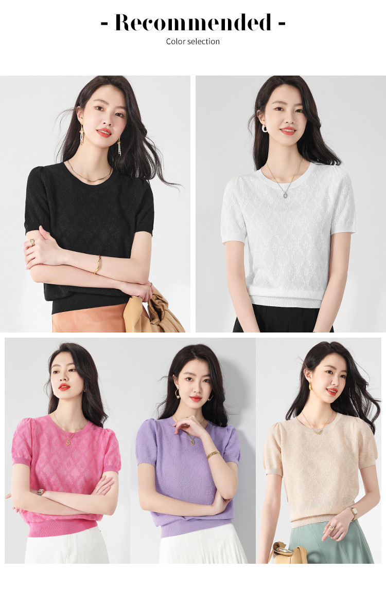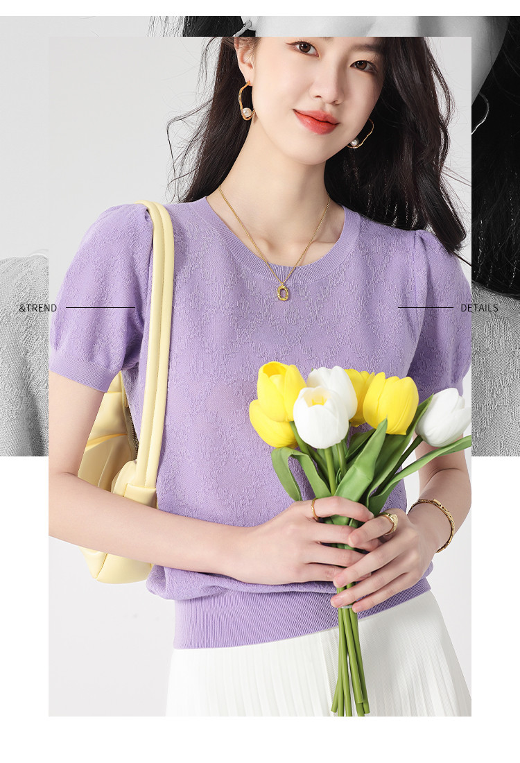 商品名称:轻薄纯色圆领提花含桑蚕丝针织打底短袖T恤针织衫女夏 140627