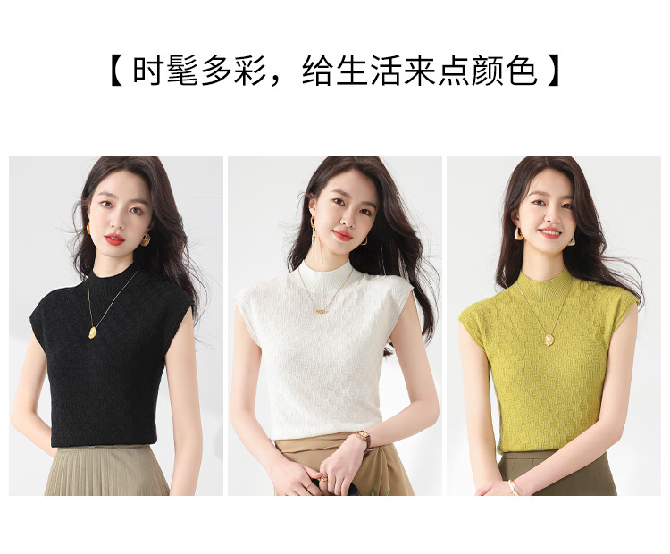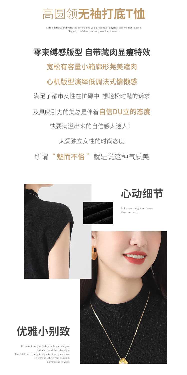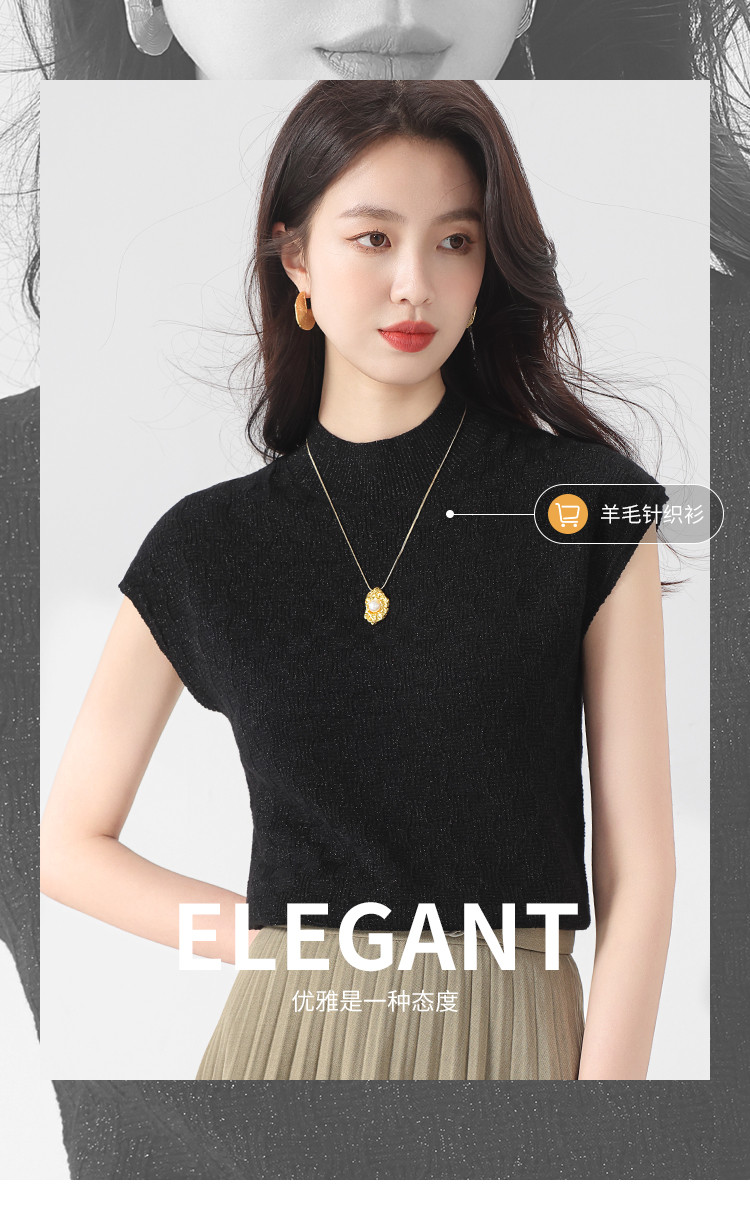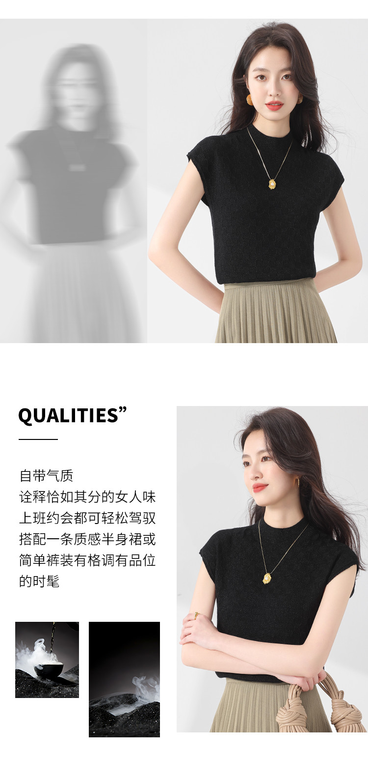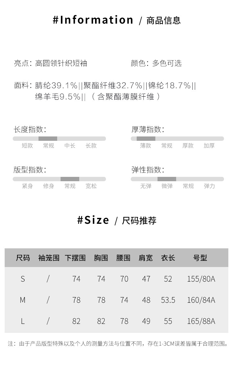 商品名称:轻薄透气简约百搭纯色高圆领含绵羊毛针织打底短袖T恤 806355