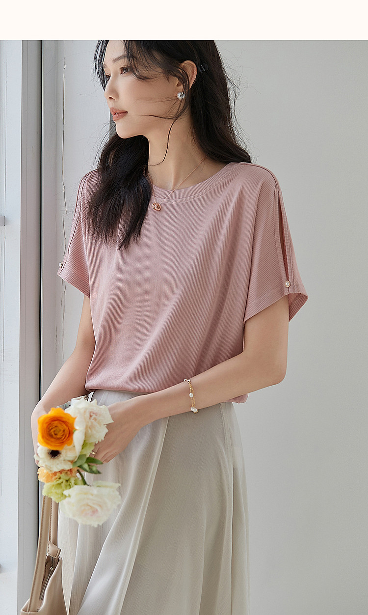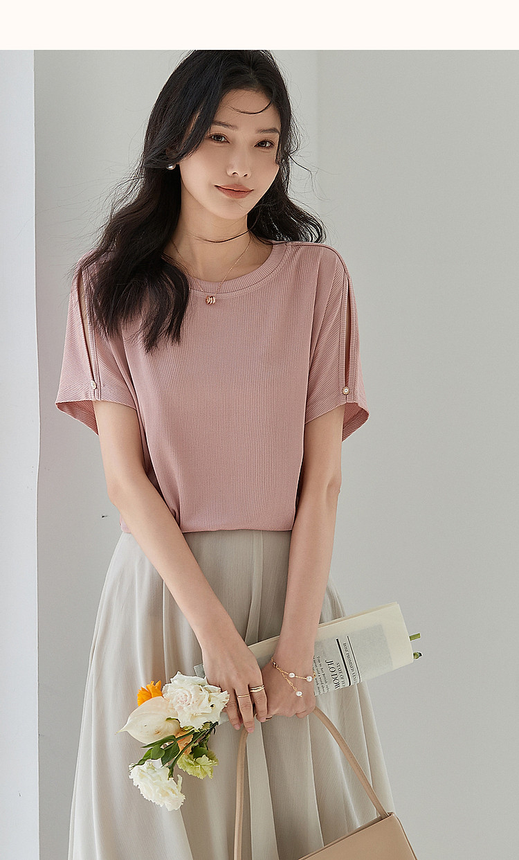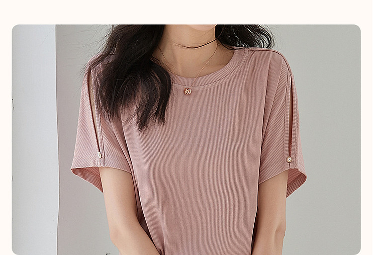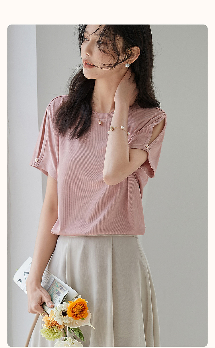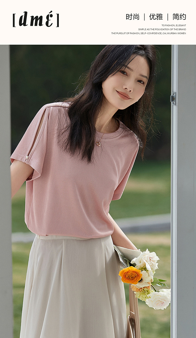 商品名称:【去繁就简】夏新轻熟风光泽感肌理圆领短袖t恤女连袖露肩女式t恤 633473