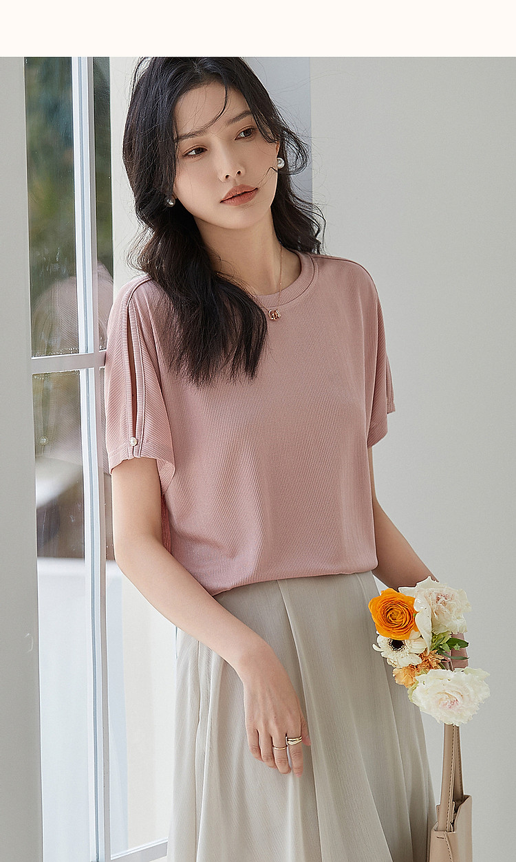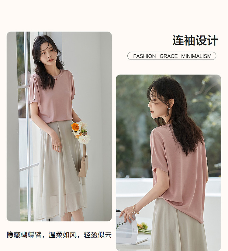 【去繁就简】夏新轻熟风光泽感肌理圆领短袖t恤女连袖露肩女式t恤 633473