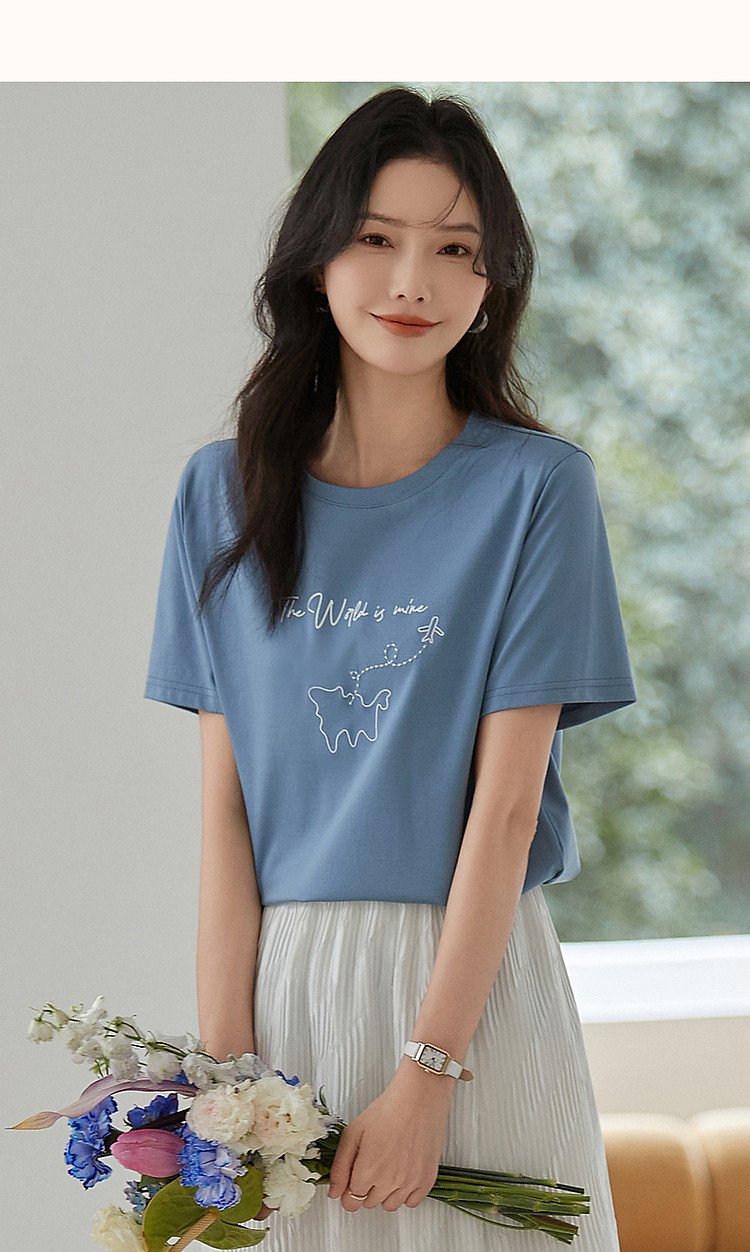 【含桑蚕丝180G丝光棉】夏季轻氧圆领字母印花小个子女式t恤 547457