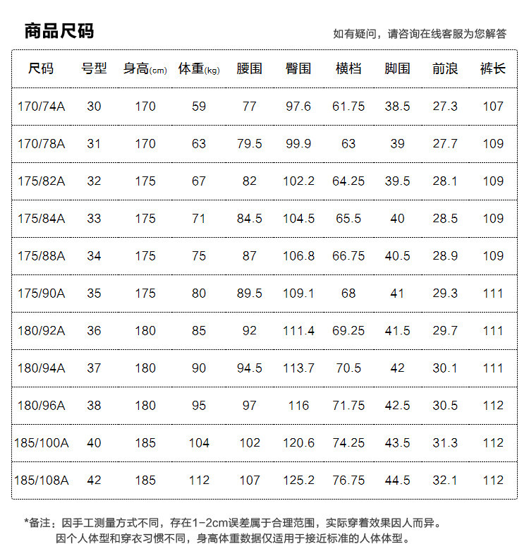 | 37(推荐86~90kg) | 42 | 94.5 | 111 | 30.1 | 113.7 | 180/94A |