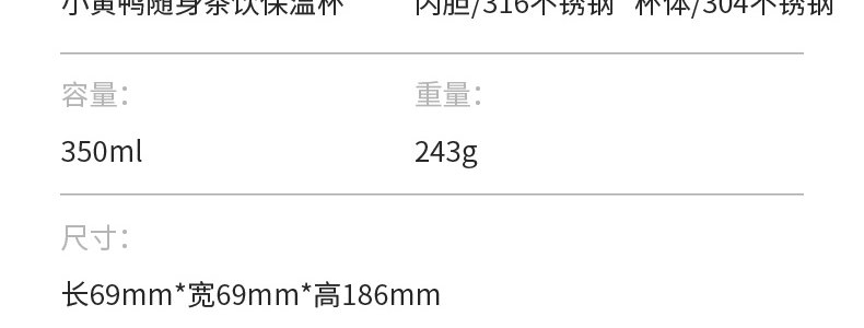 商品名称:香港小黄鸭 (B.DUCK)小黄鸭泡茶保温杯 极光白 350ml BD-KV35E(内置长筒茶隔)