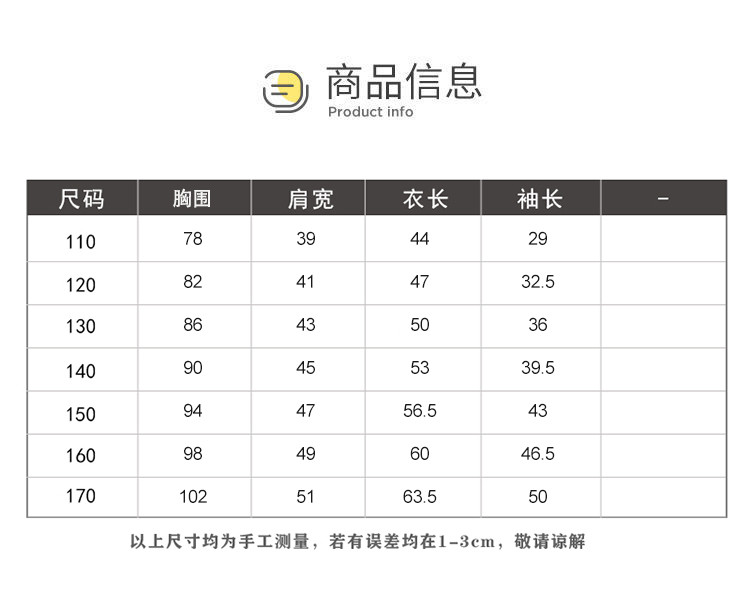 | 尺码 | 衣长(cm) | 肩宽(cm) | 袖长(cm) | 适合年龄 | 胸围(cm) | 号型 |