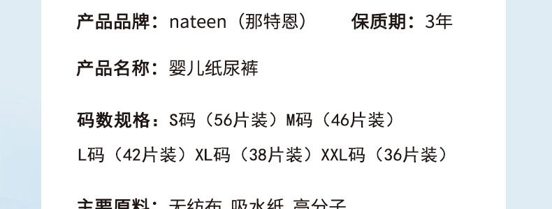 商品名称:比利时 那特恩(nateen)新自然风婴儿纸尿裤 试用装L6(7-18kg)