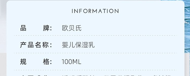 商品名称:欧贝氏 婴儿保湿乳100ml/瓶