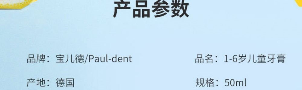 商品名称:德国 宝儿德(Paul-dent)儿童牙膏水蜜桃味1-6岁 50ml