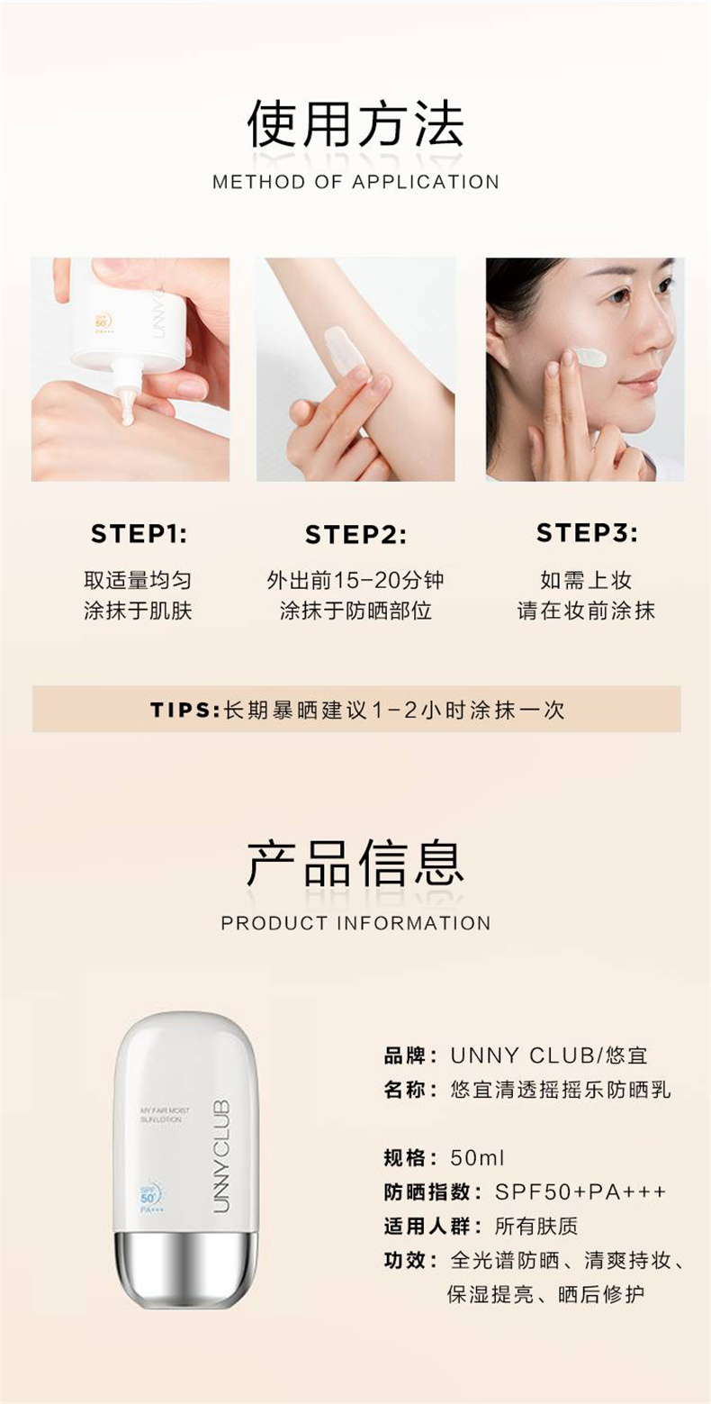商品名称:UNNY悠宜 清透摇摇乐防晒乳 50ml SPF50+ PA+++ 清爽水感 防晒不减