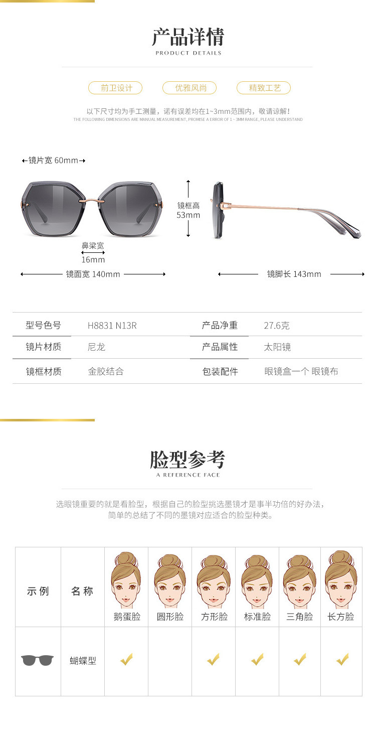 商品名称:海伦凯勒眼镜墨镜女太阳镜防紫外线开车驾驶墨镜女士太阳镜 189851