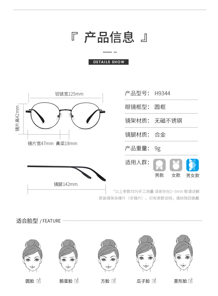 镜面宽度:125mm;镜片高度:42mm;鼻距:18mm