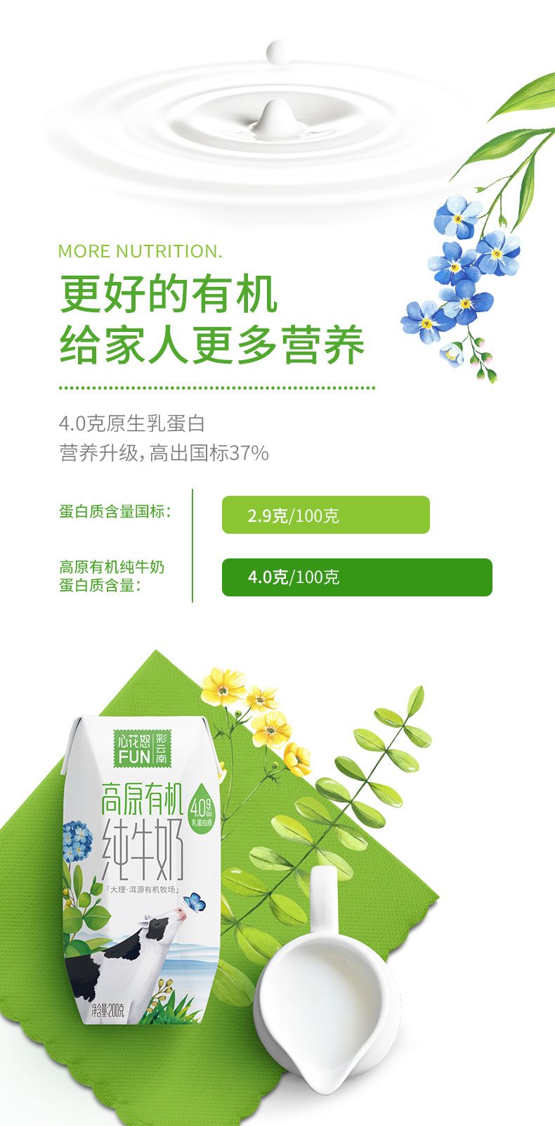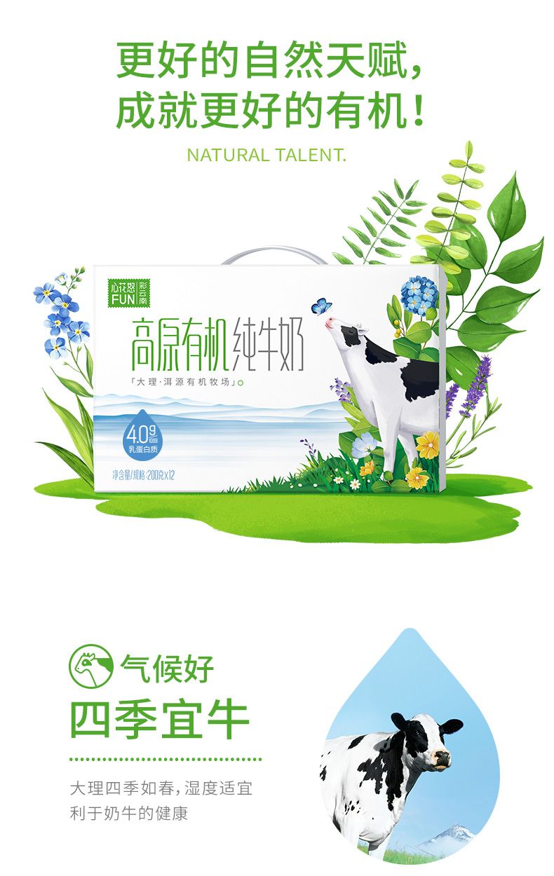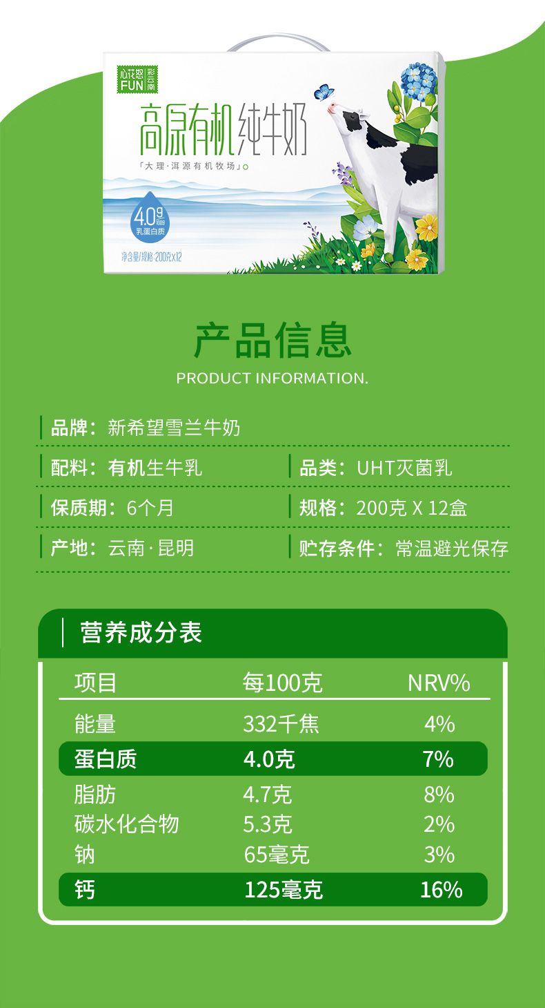 商品名称:新希望雪兰心花怒FUN高原有机纯牛奶200g*12盒*2箱