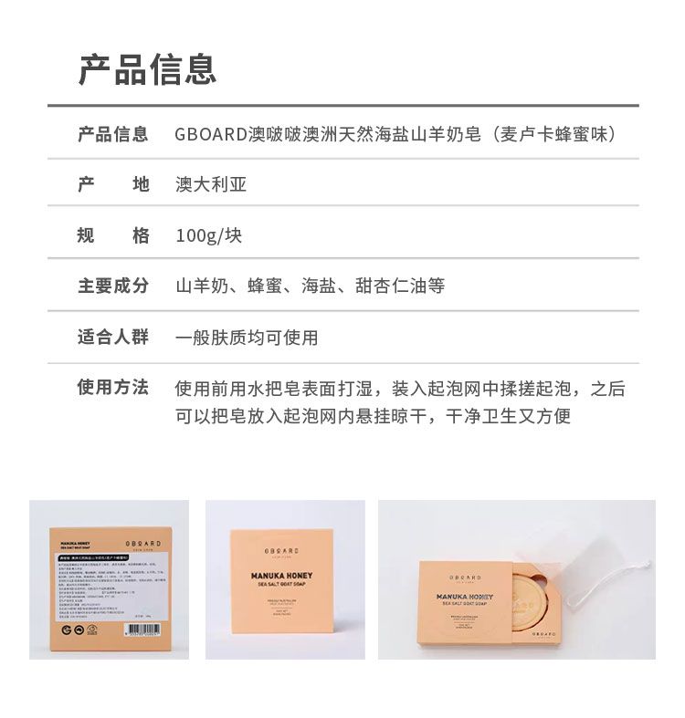 商品名称:澳啵啵 澳洲天然海盐山羊奶皂 麦卢卡蜂蜜味 100g