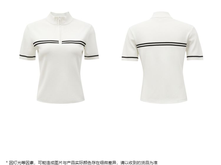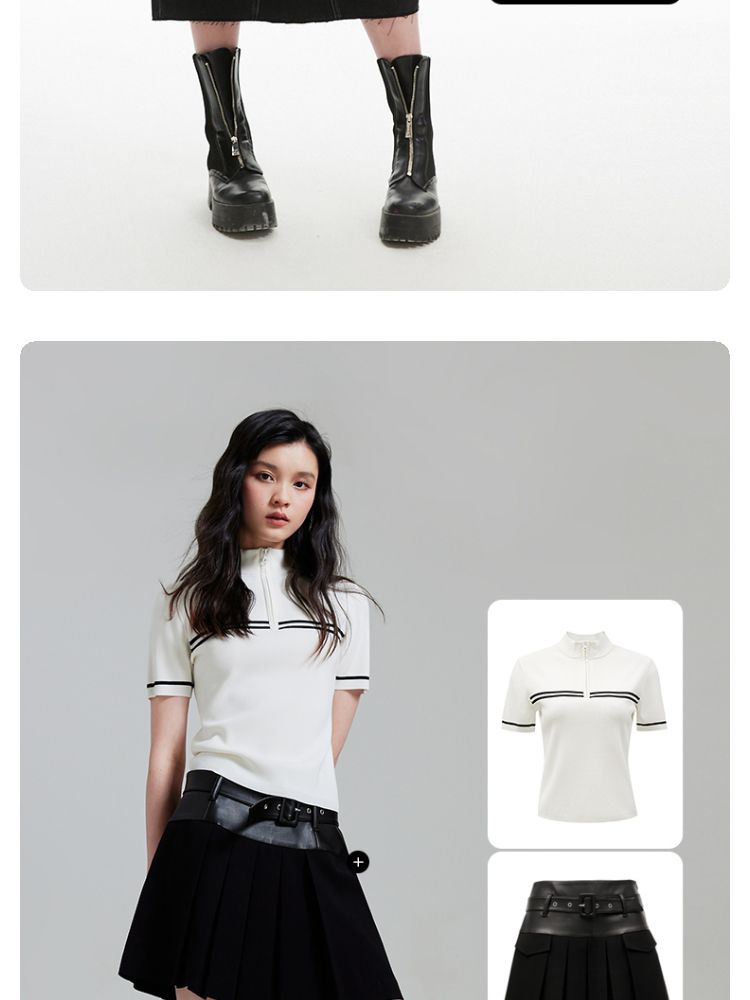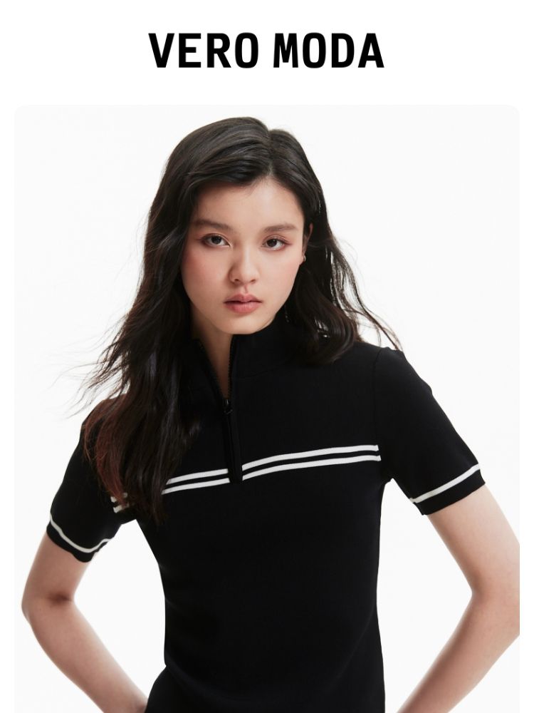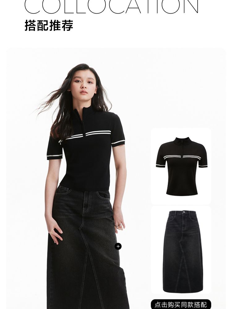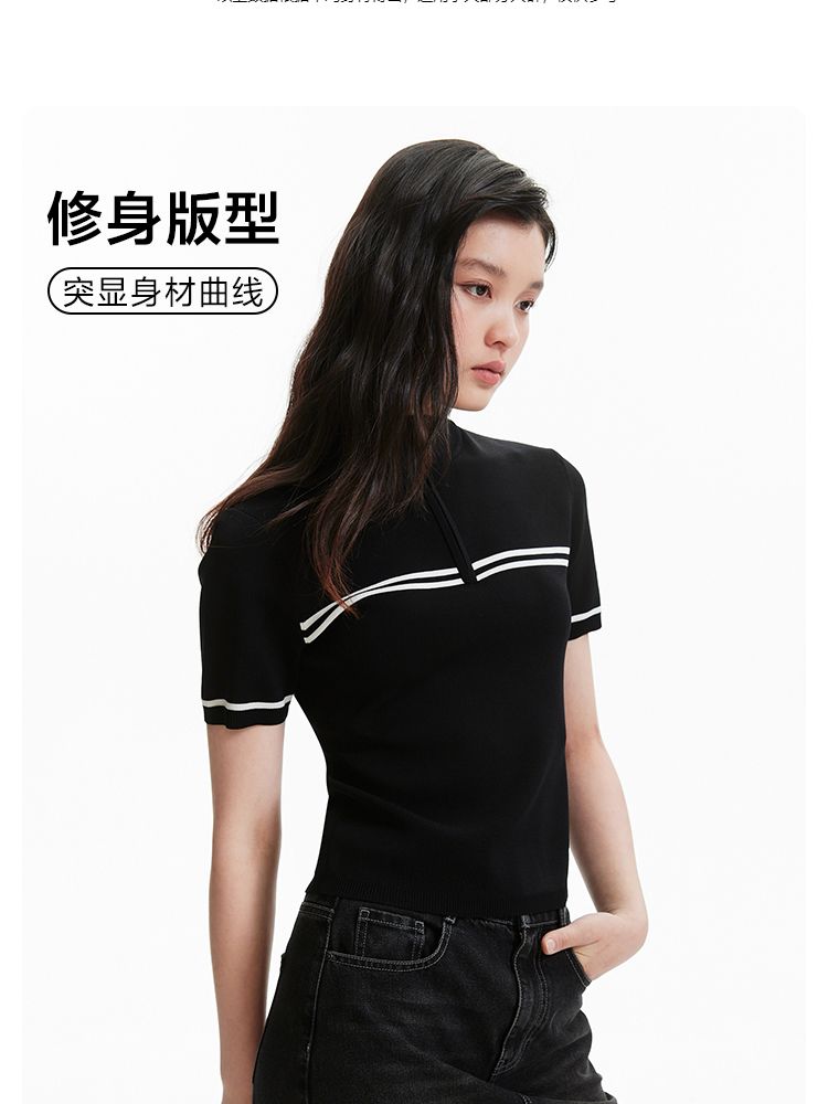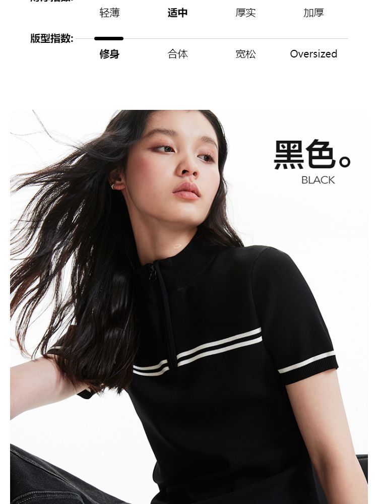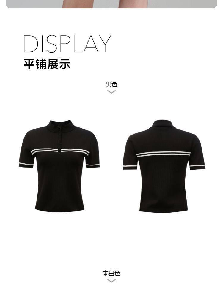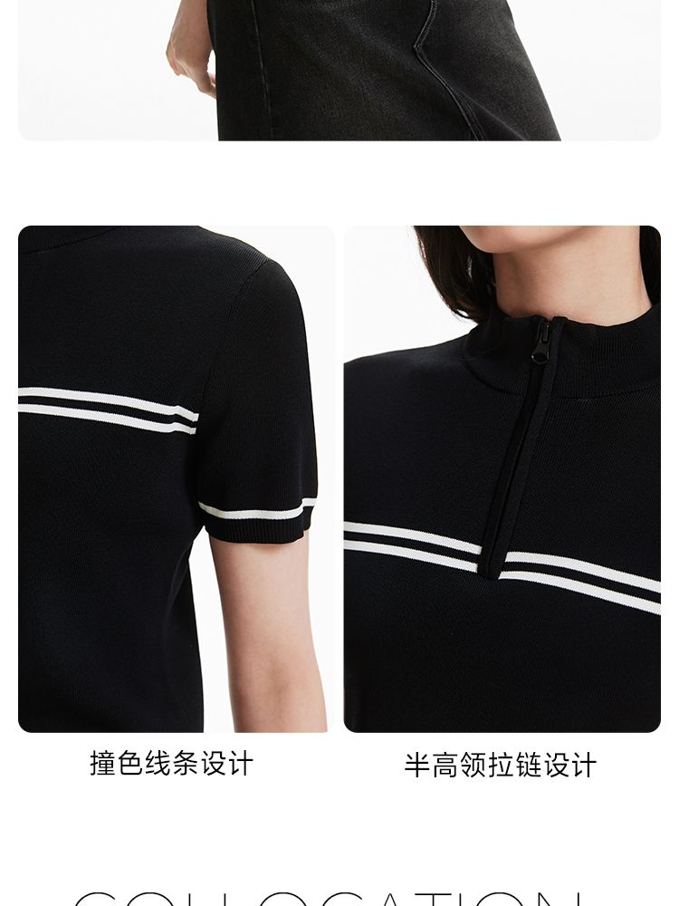 商品名称:【条纹撞色】针织衫女黑白撞色修身半高领拉链短袖上衣 418833
