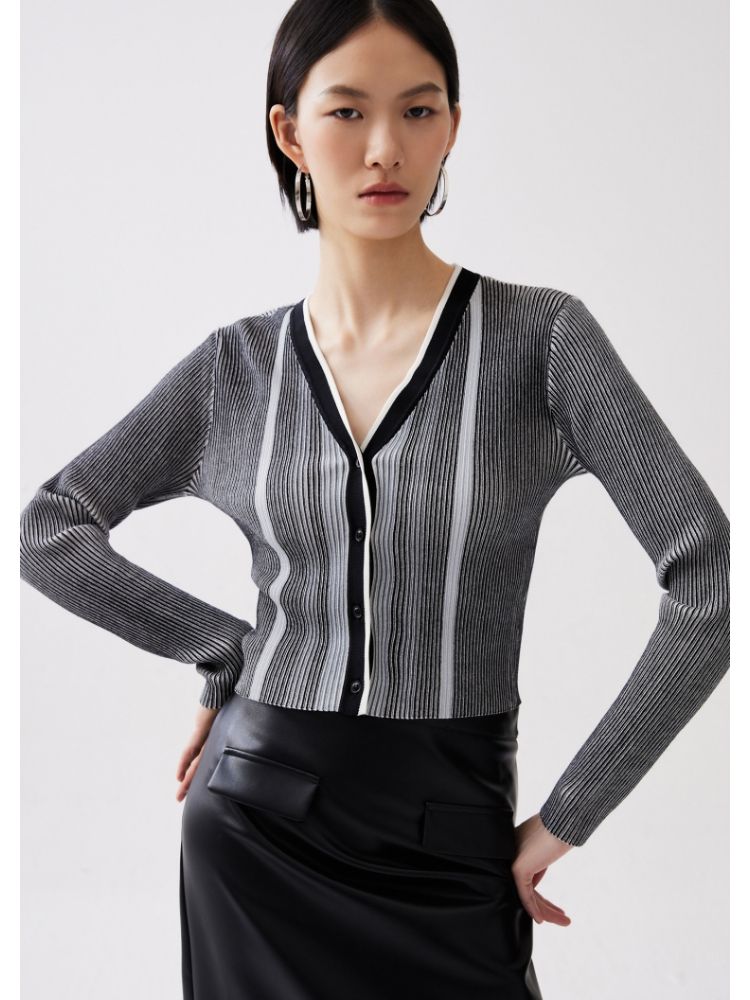【柔软开衫】针织衫女修身短款V领坑条弹力长袖通勤空调衫外搭 505617