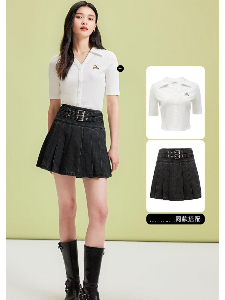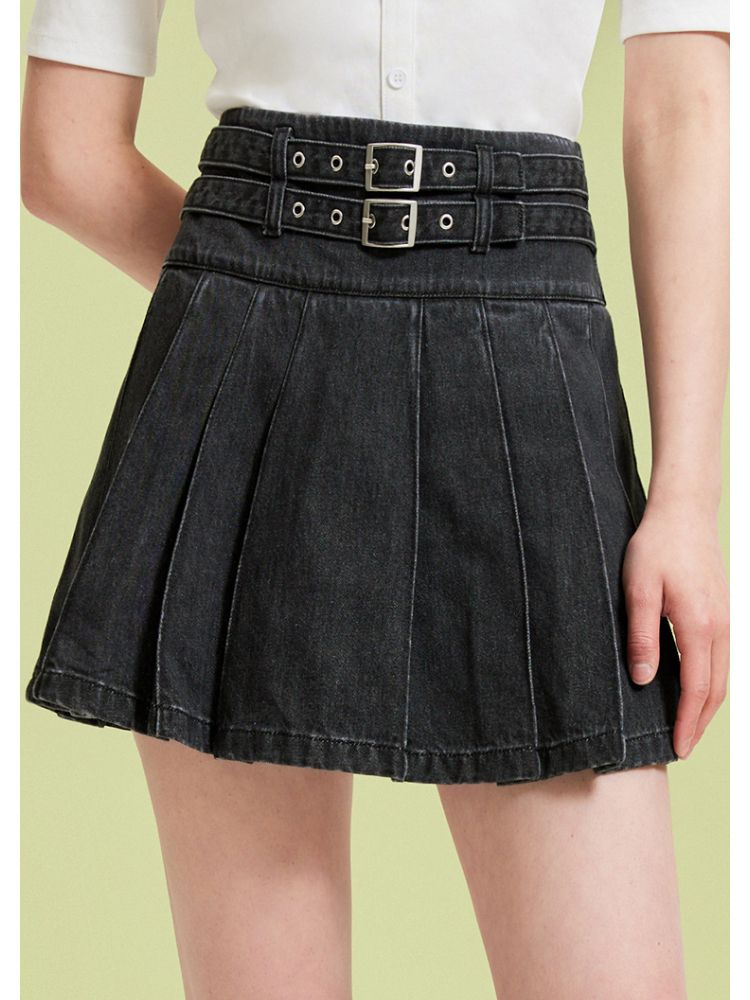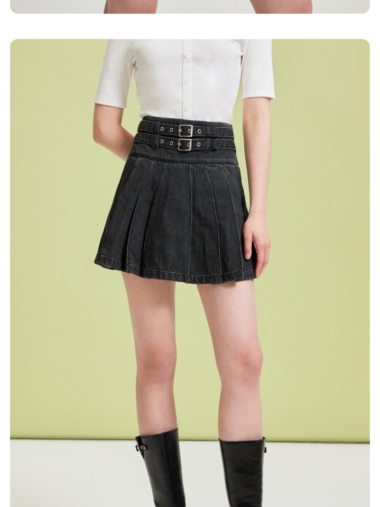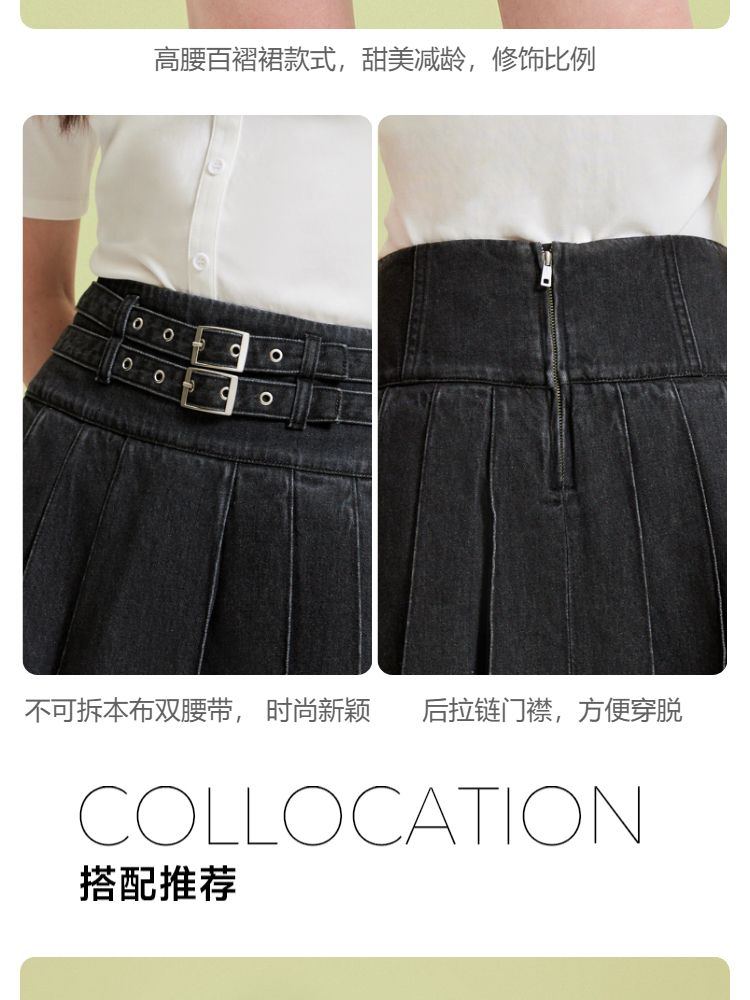 商品名称:半身裙学院风牛仔双腰带高腰百褶裙减龄 541521