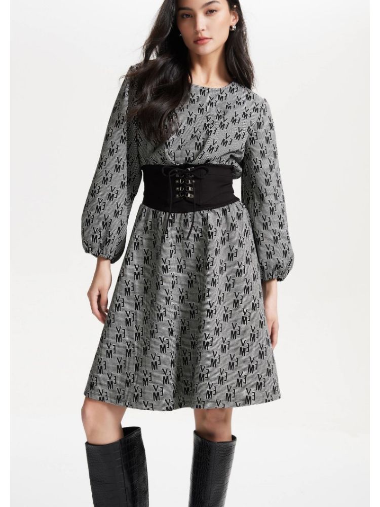 【松紧绑带腰封】优雅通勤修身七分袖连衣裙 112913