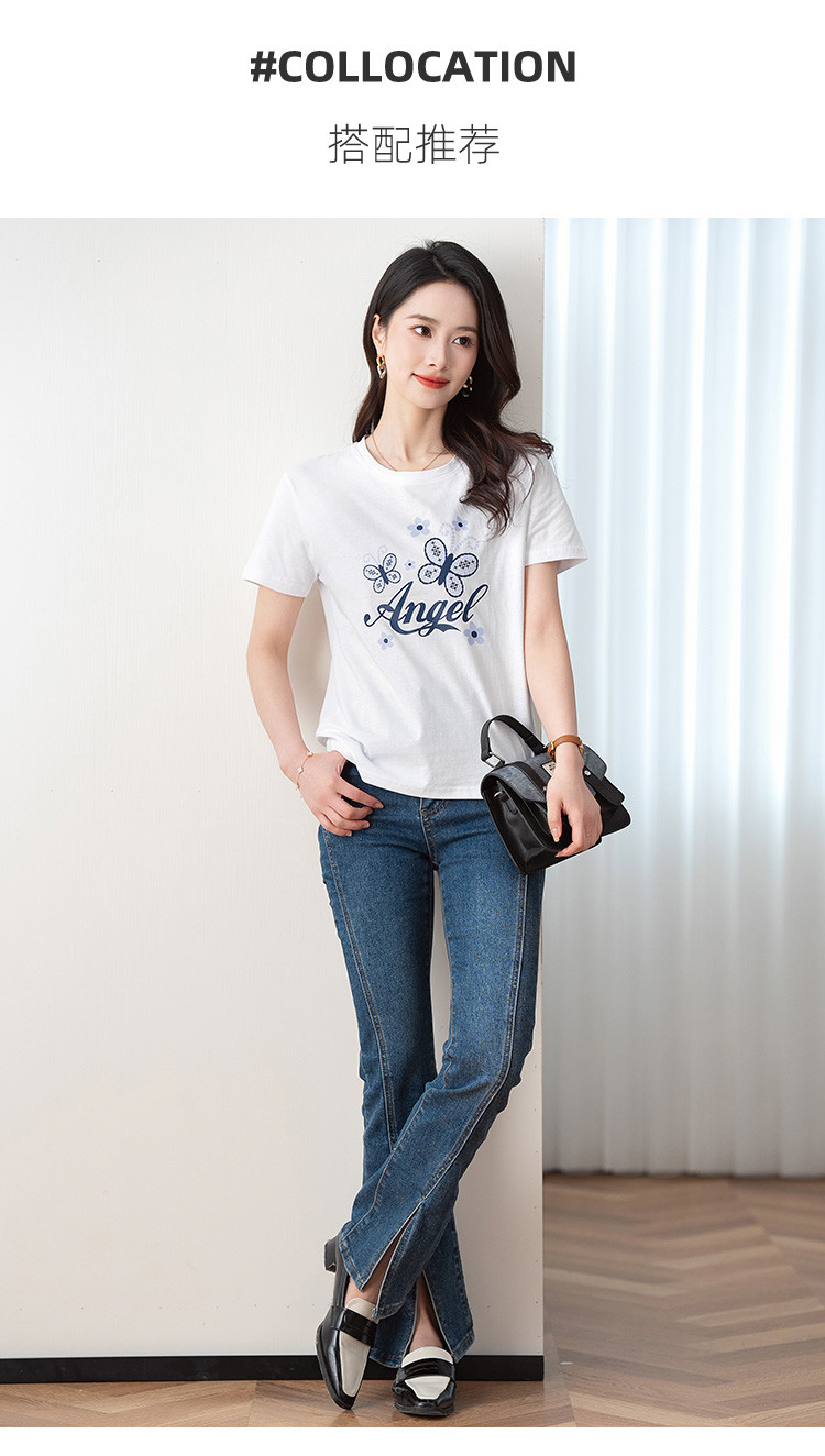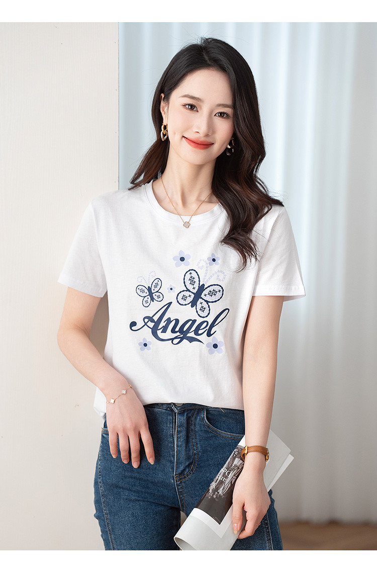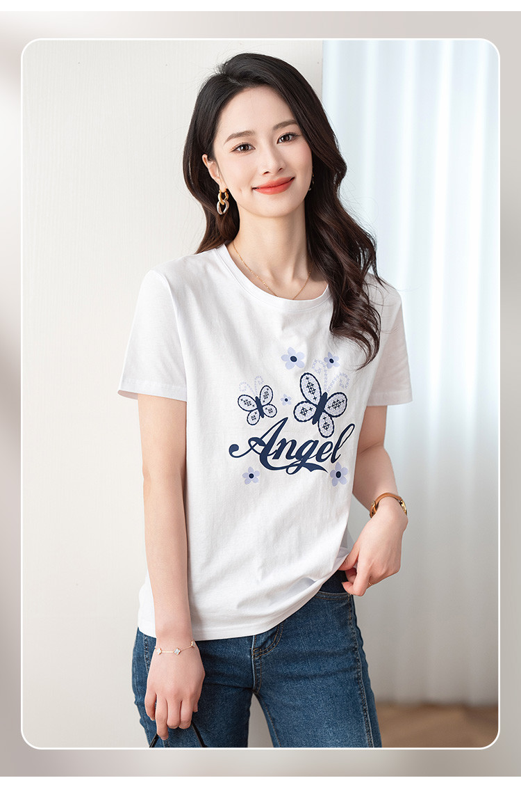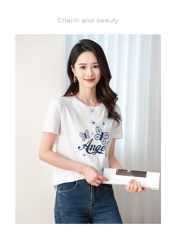 【100%棉】夏季时尚前胸印花短袖t恤女宽松舒适百搭休闲打底衫 383256