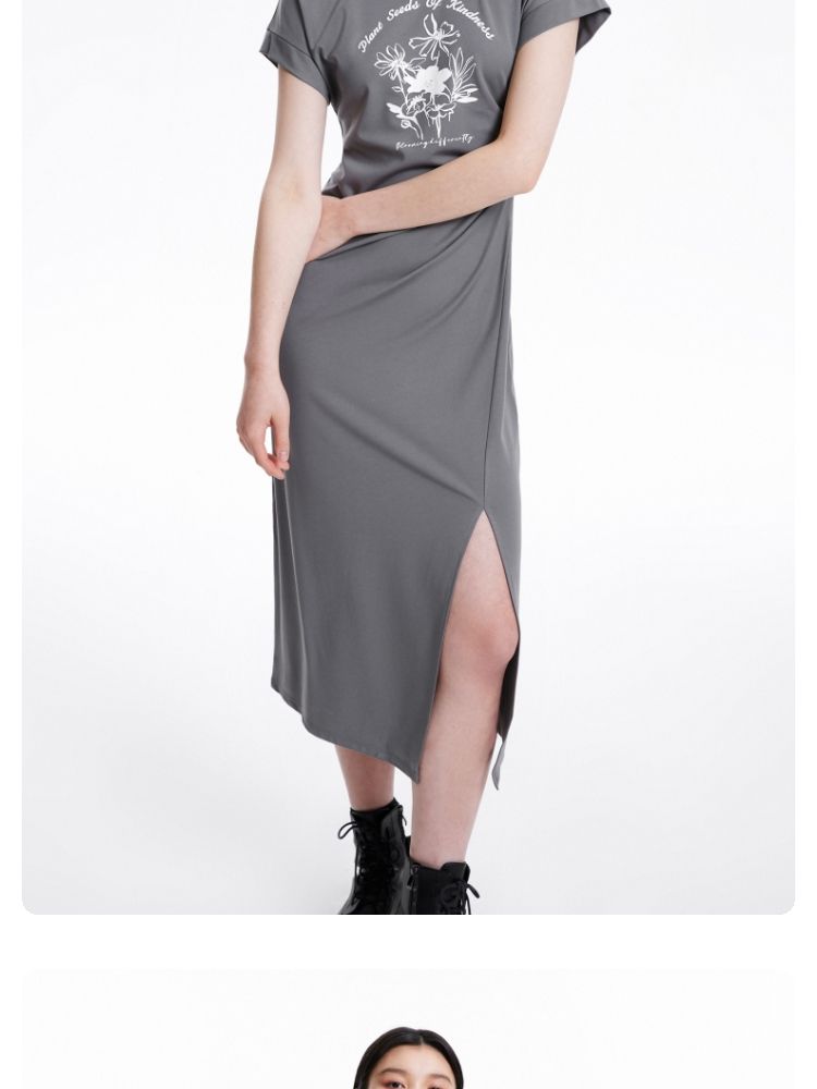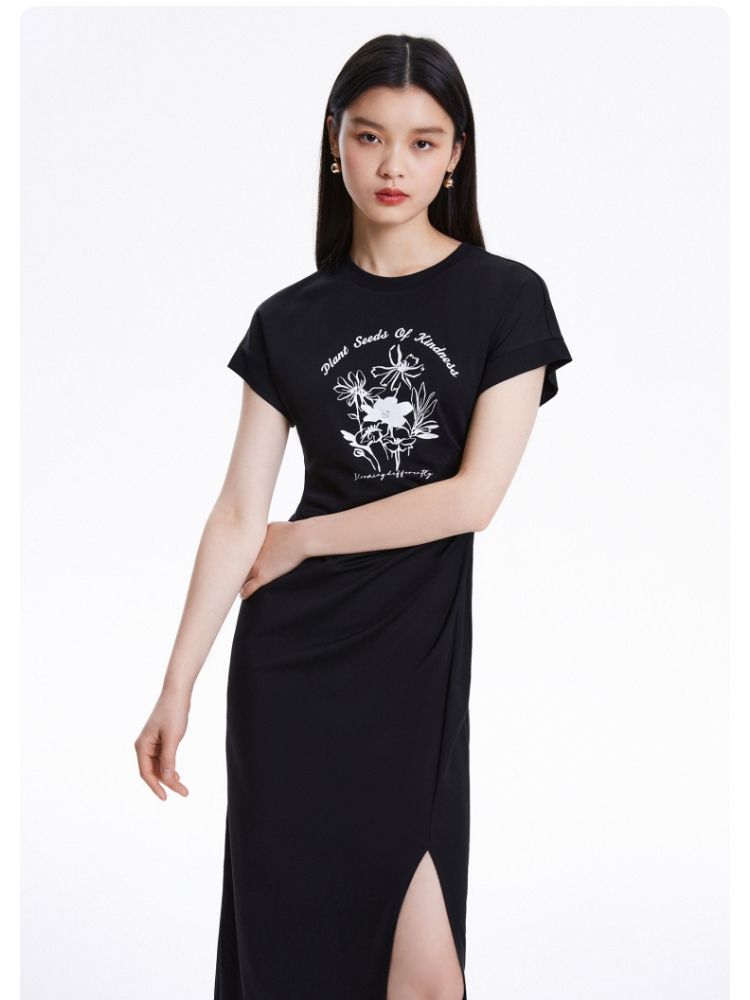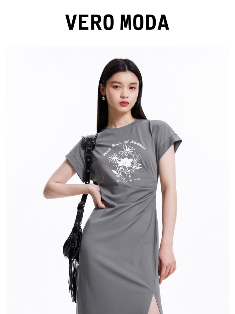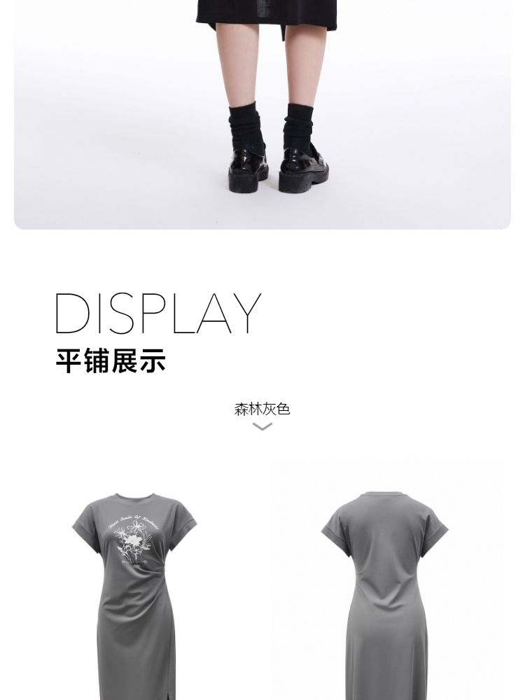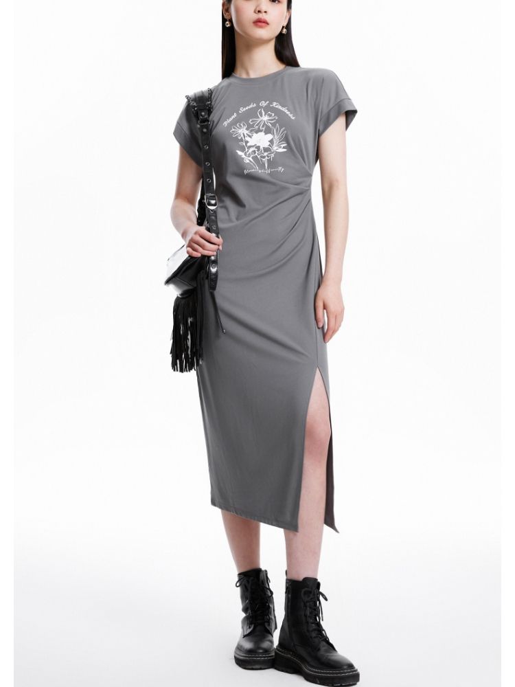 连衣裙圆领收腰褶皱印花美式辣妹开叉T恤裙 183249
