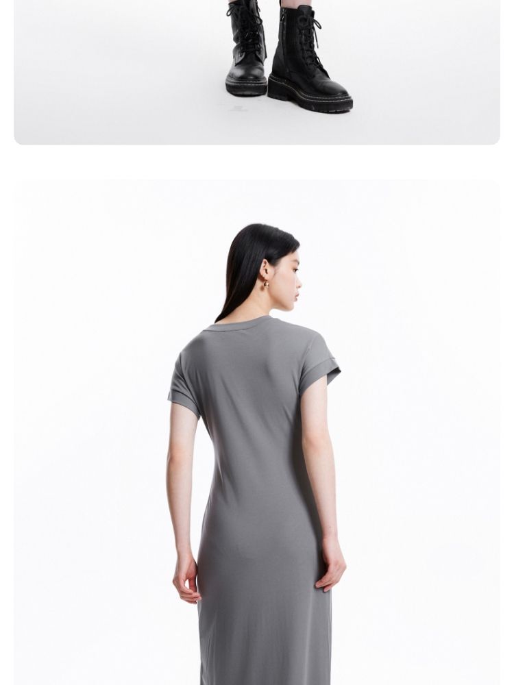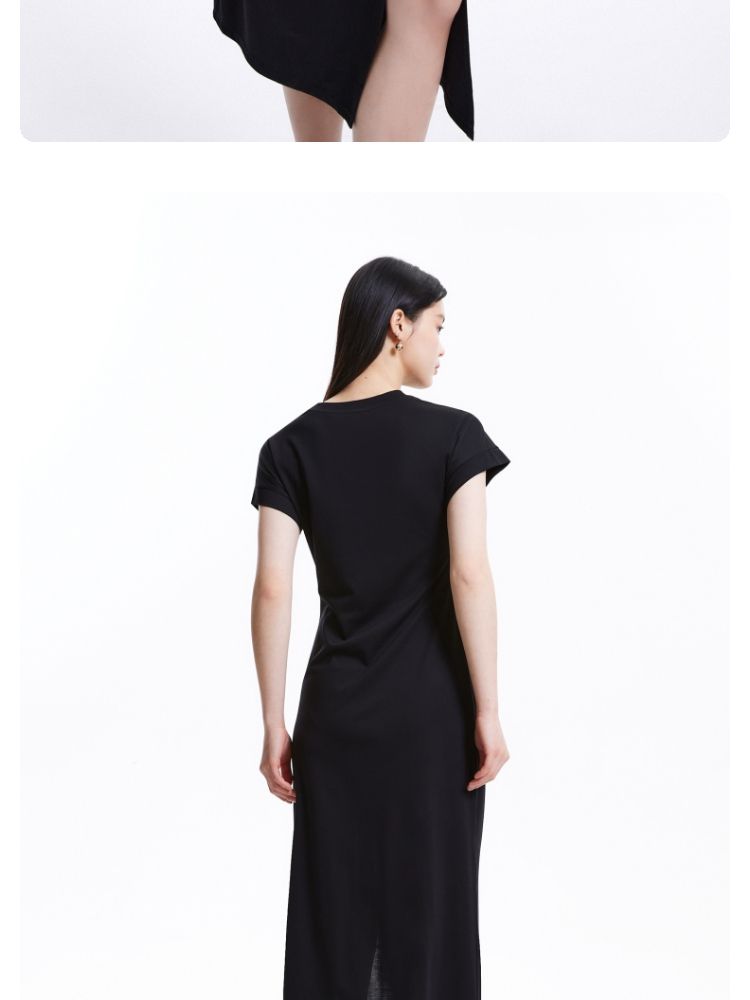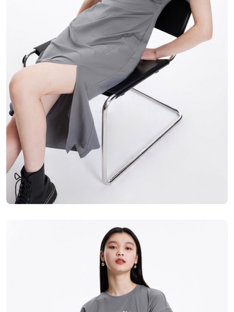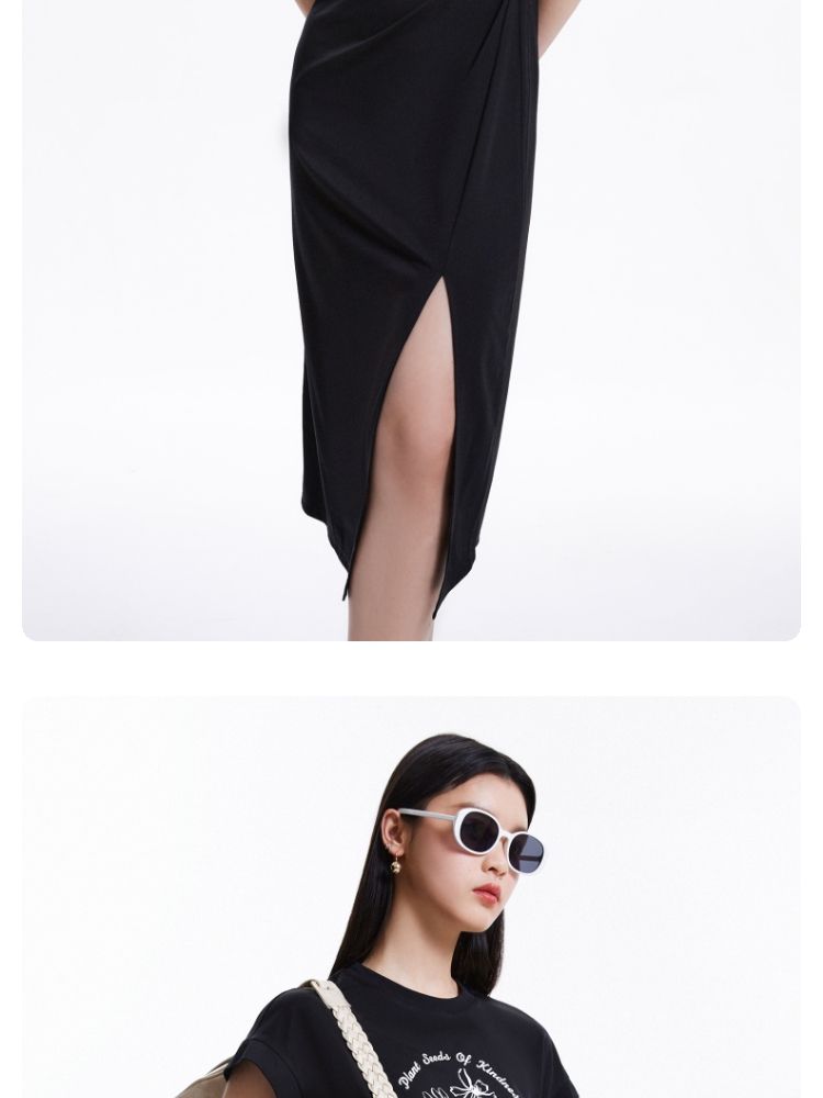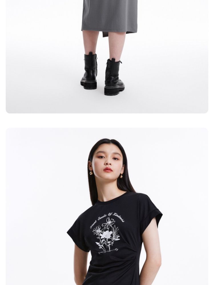 连衣裙圆领收腰褶皱印花美式辣妹开叉T恤裙 183249