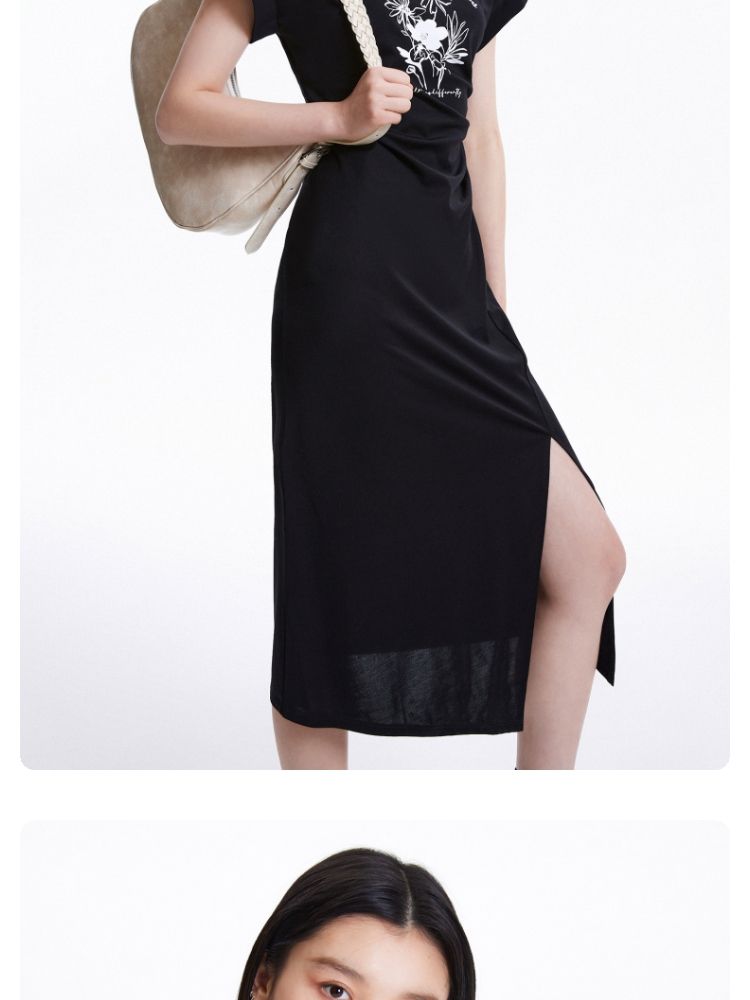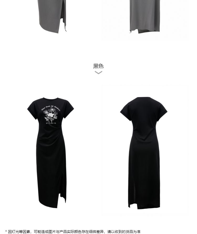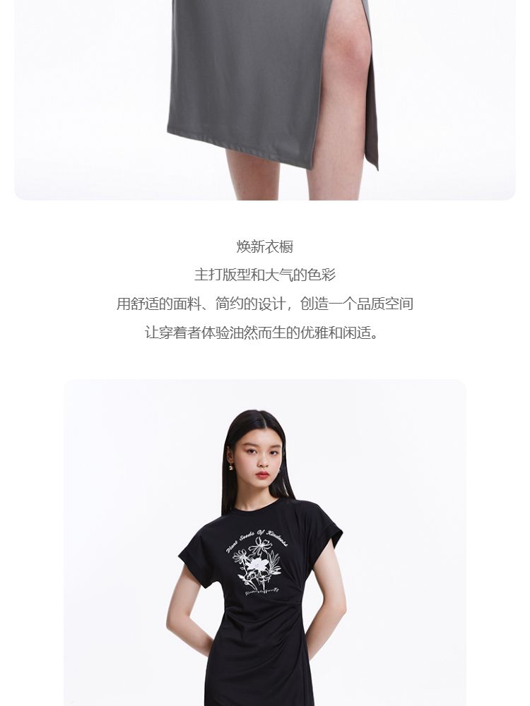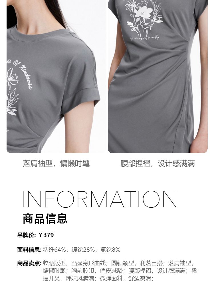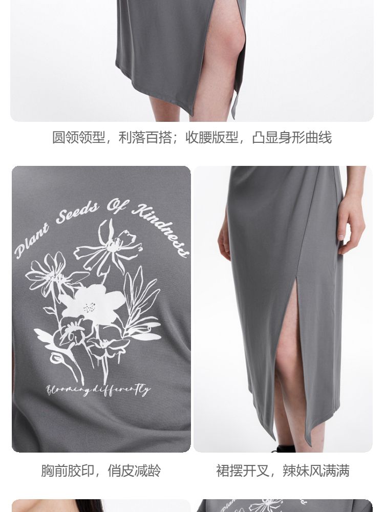 商品名称:连衣裙圆领收腰褶皱印花美式辣妹开叉T恤裙 183249