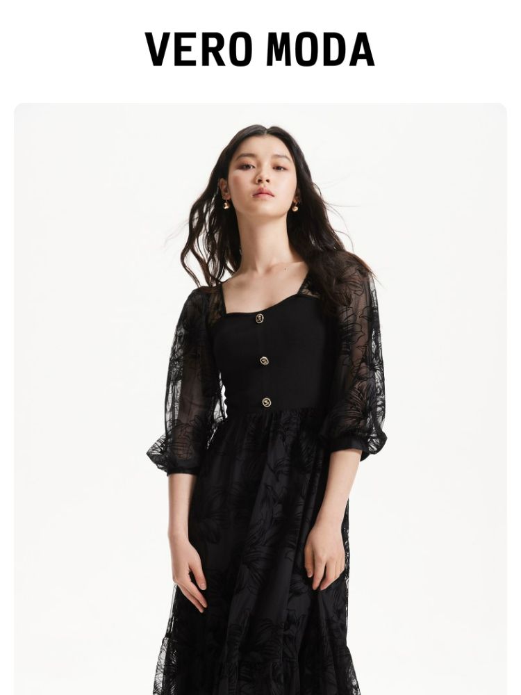 连衣裙优雅气质长裙七分袖方领拼接黑色女 987345