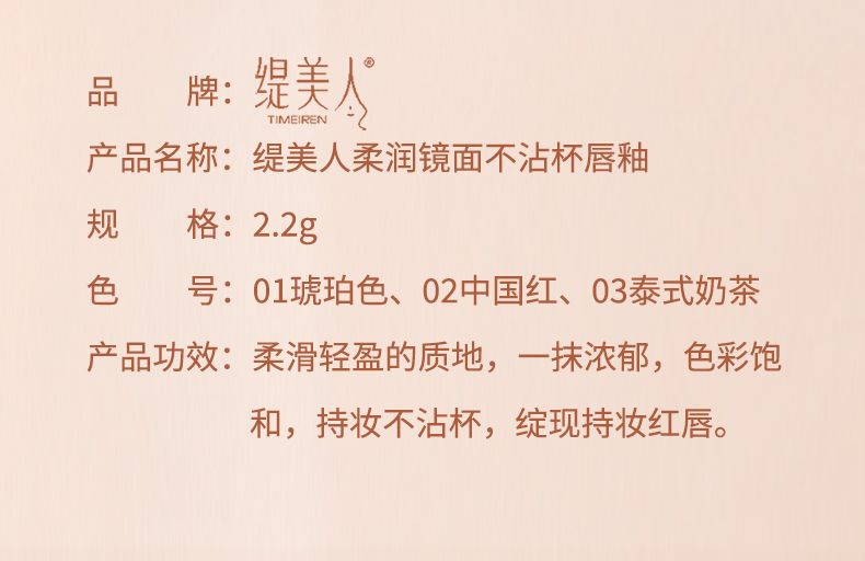 商品名称:缇美人 柔润镜面不沾杯唇釉