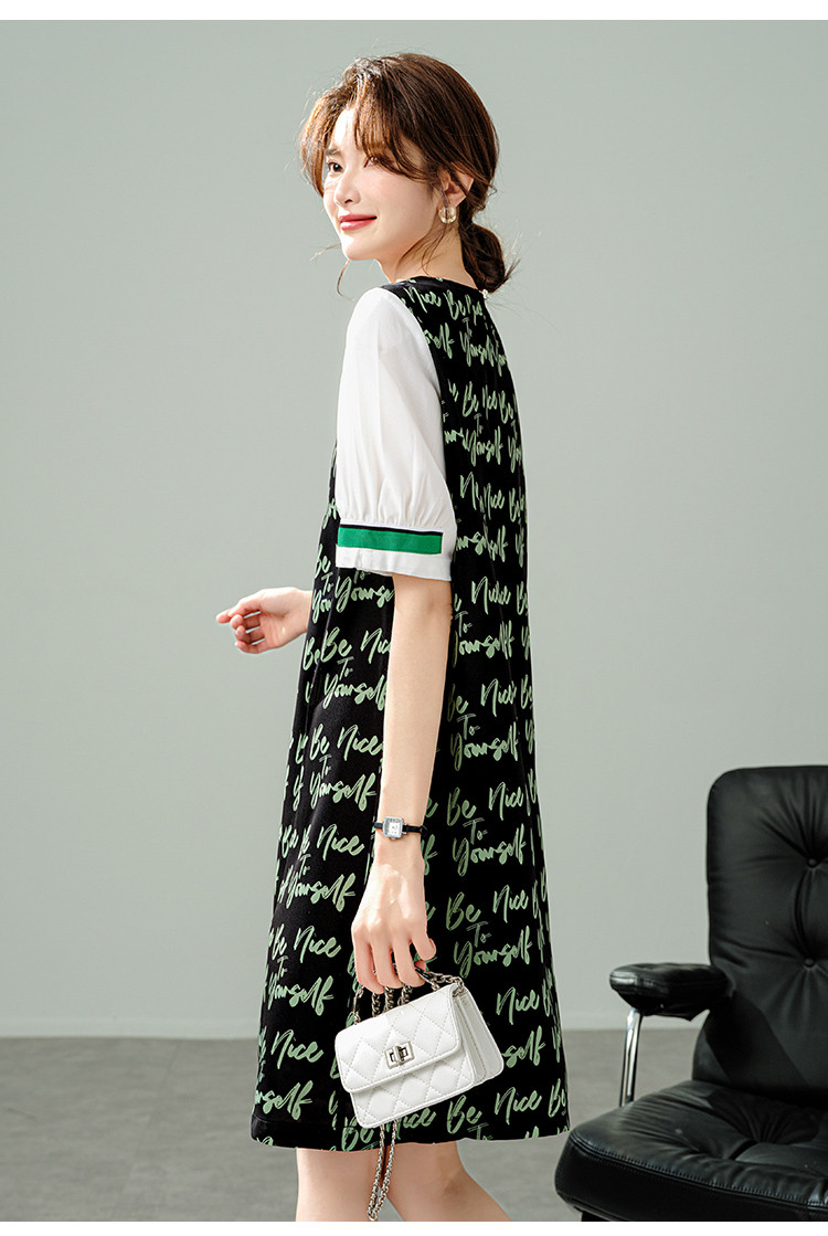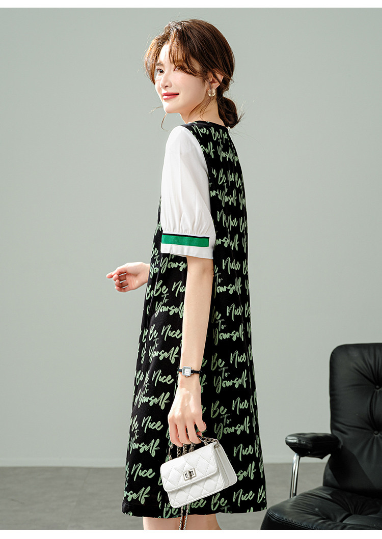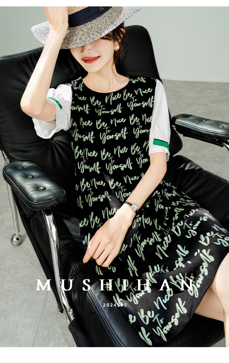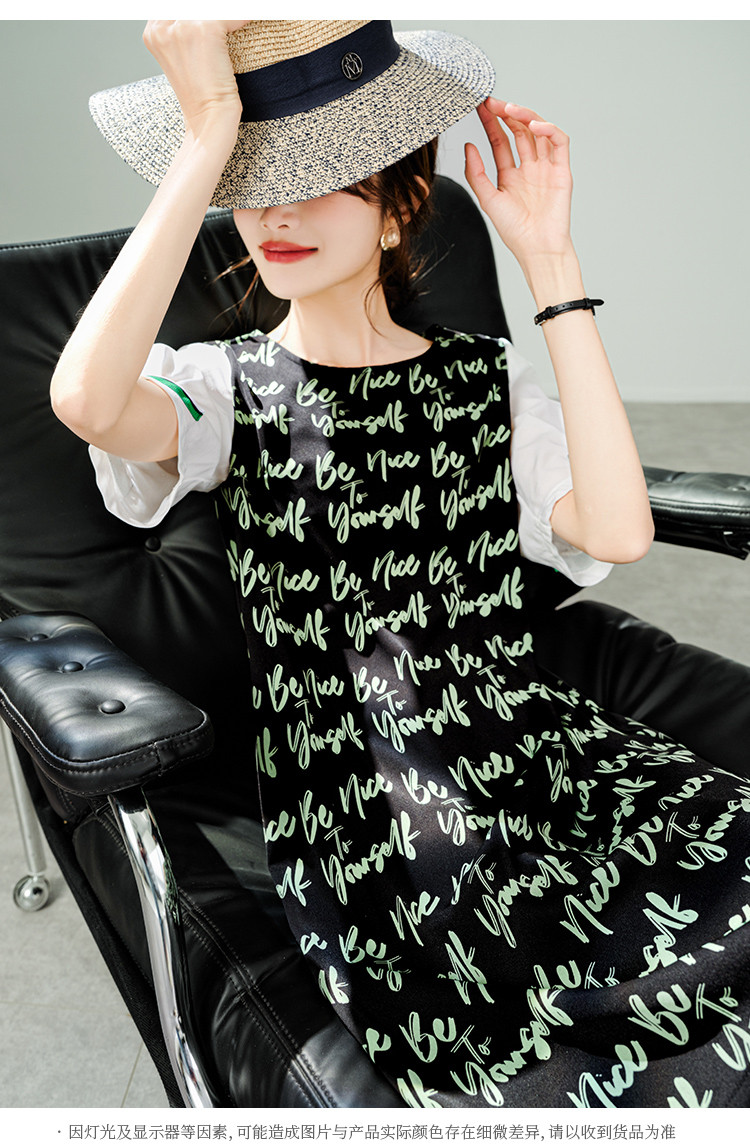 商品名称:2025夏季新款法式复古宽松显瘦高级感拼接小众字母印花连衣裙 421385