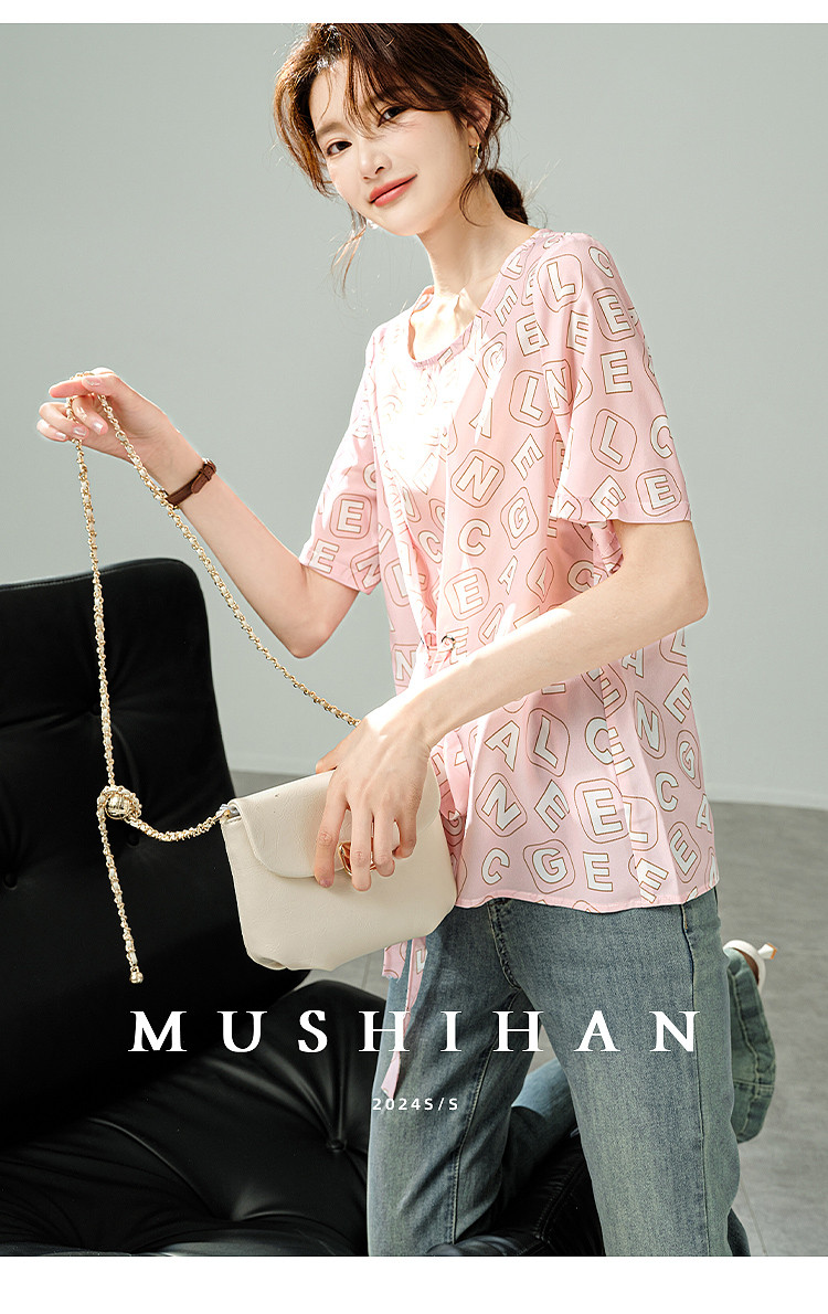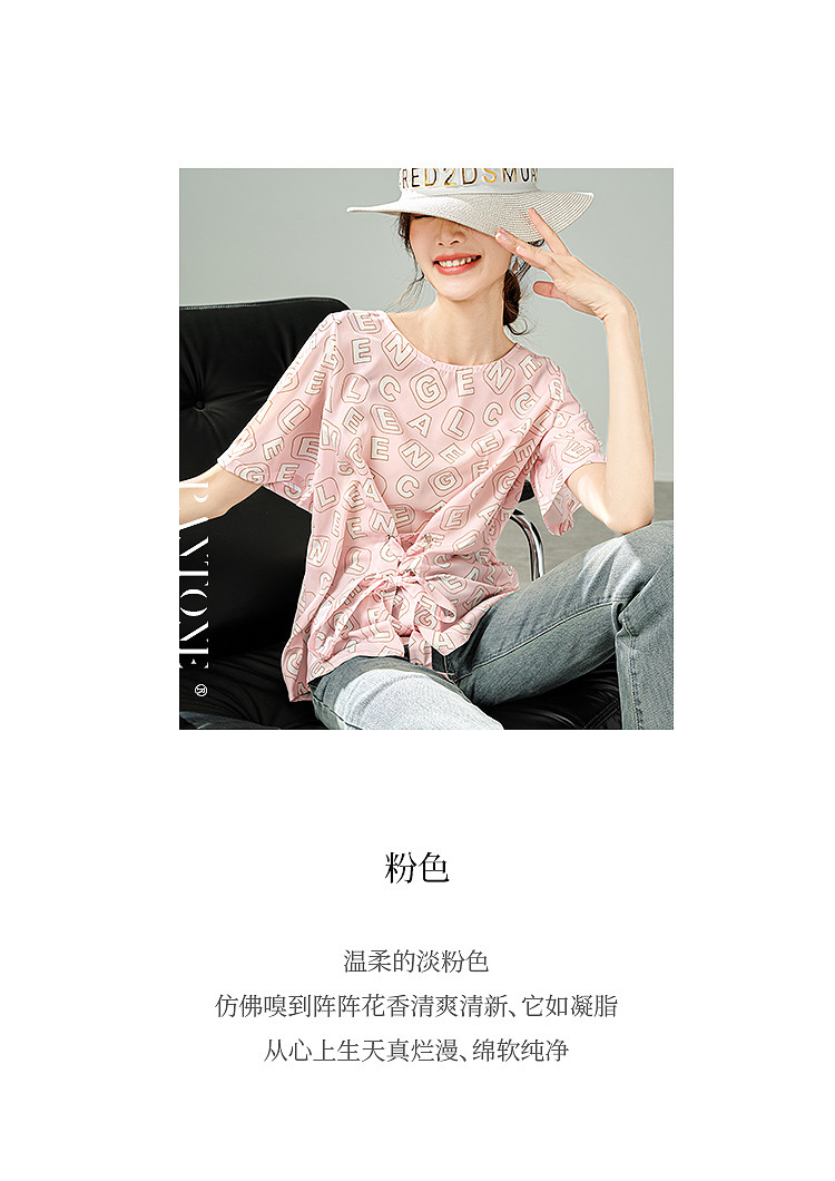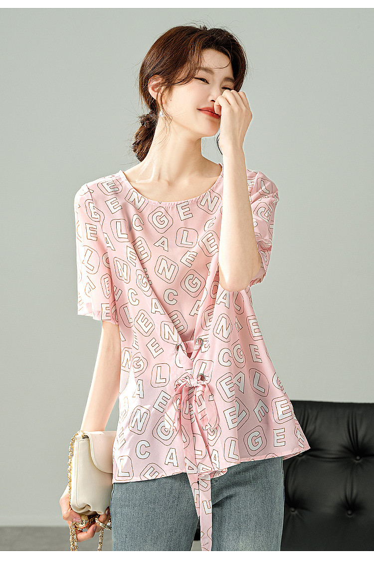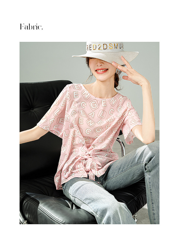 商品名称:2025夏季新款字母印花轻薄收腰T恤清新简约百搭短袖女式衬衫 503305
