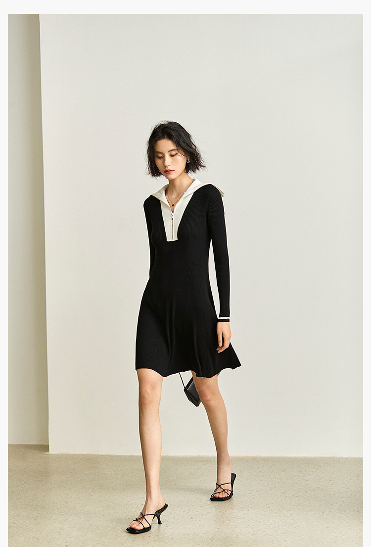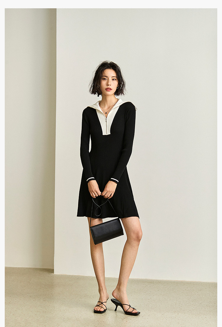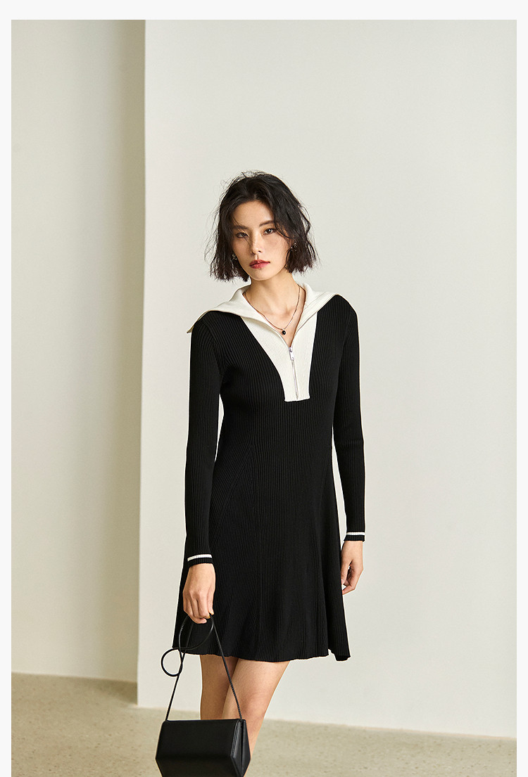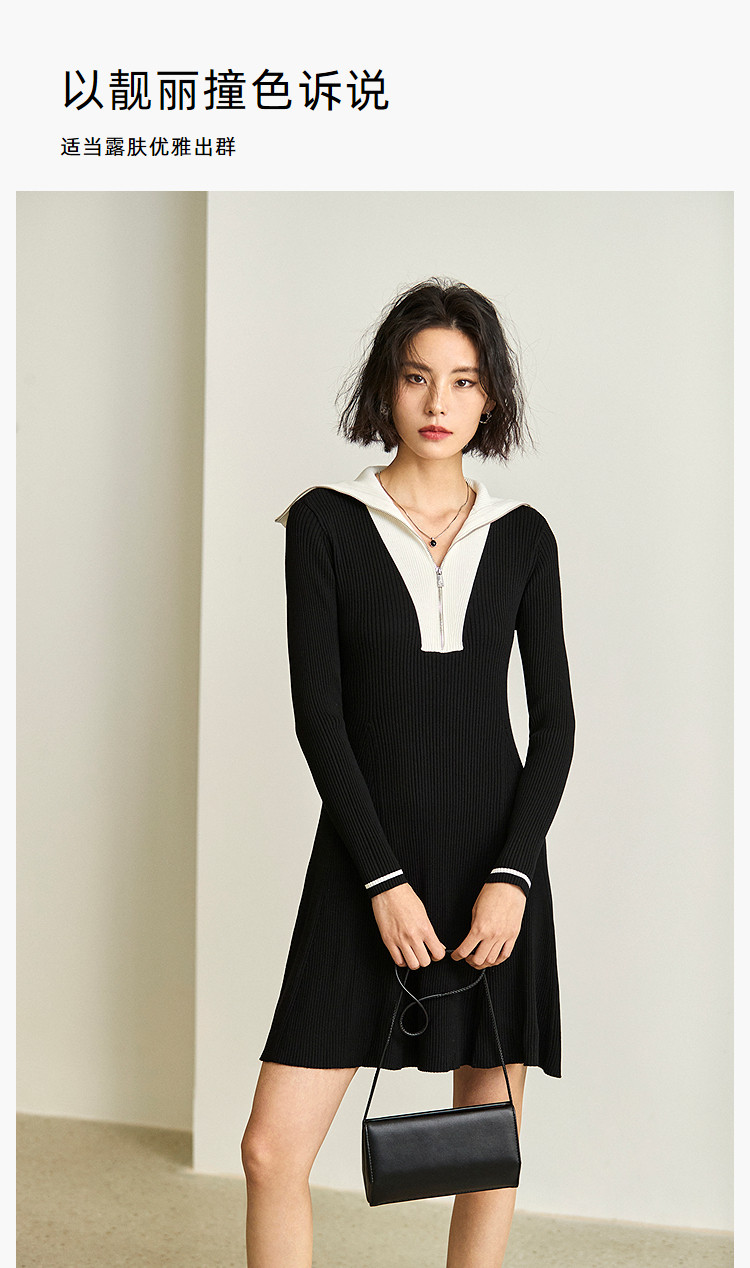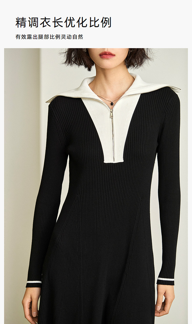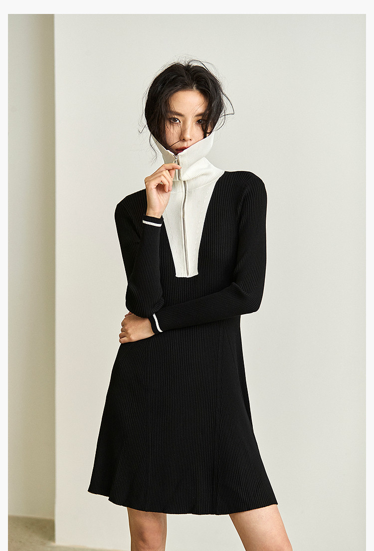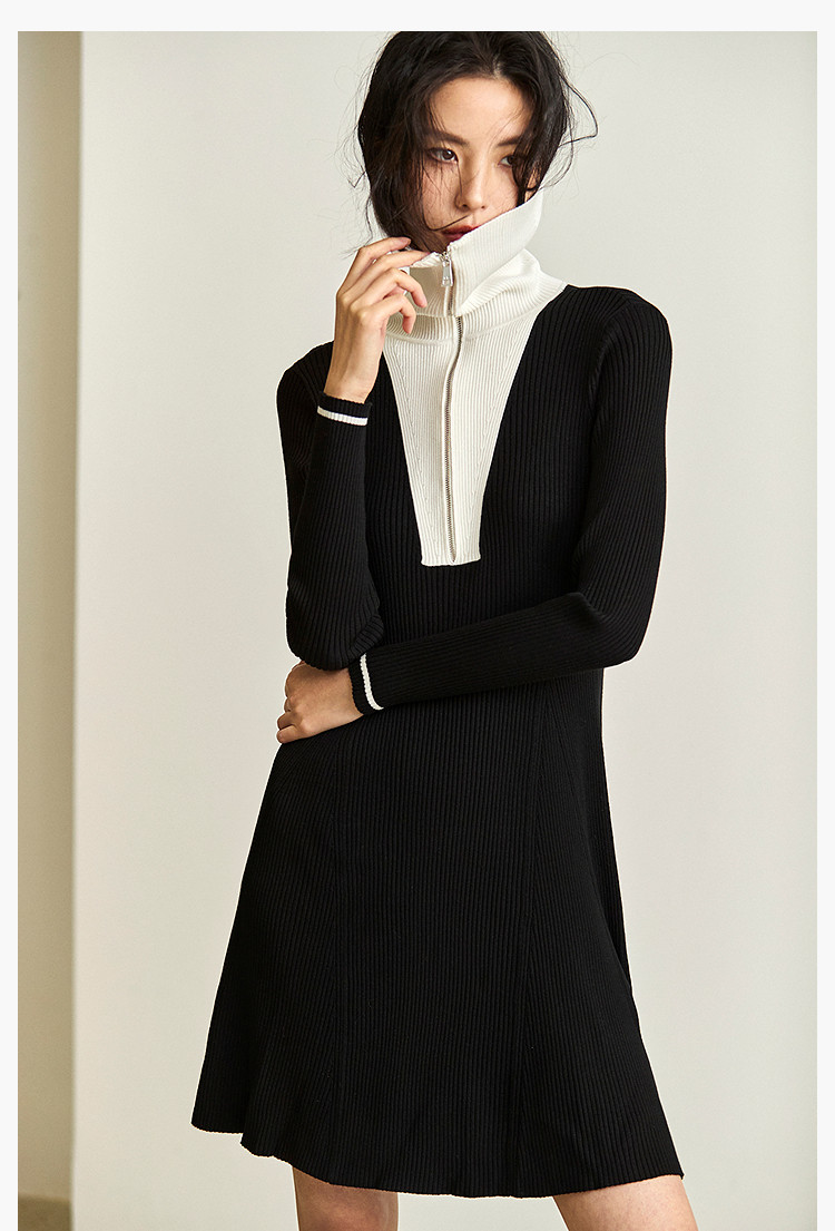 商品名称:通勤设计感撞色复古拉链翻领针织黑色连衣裙 538587