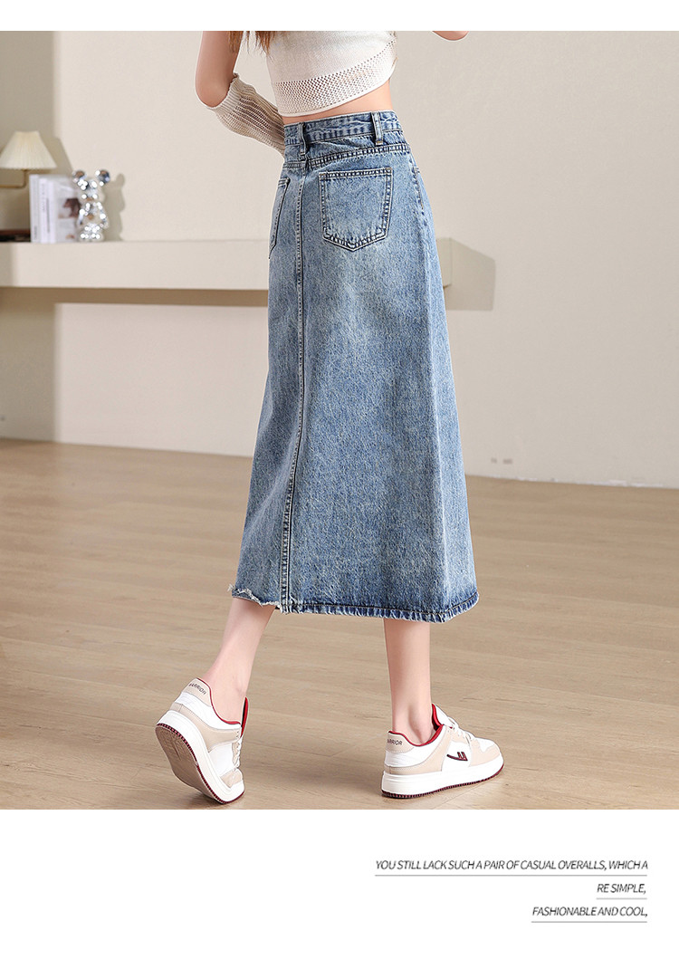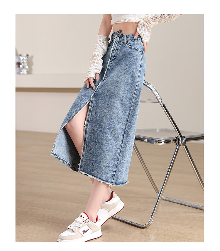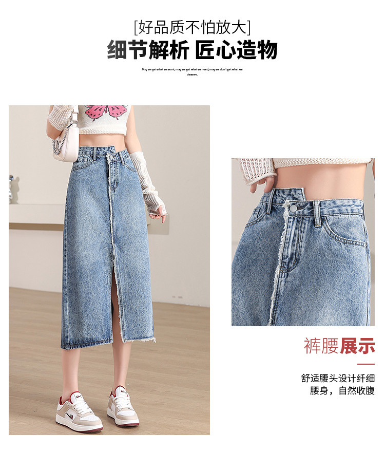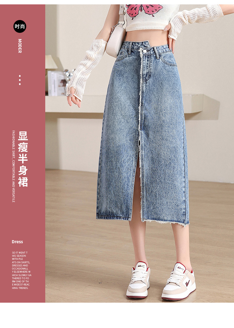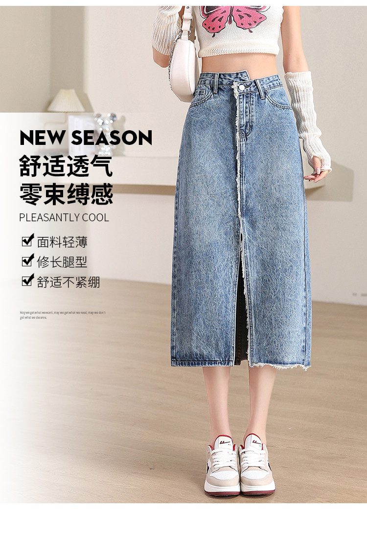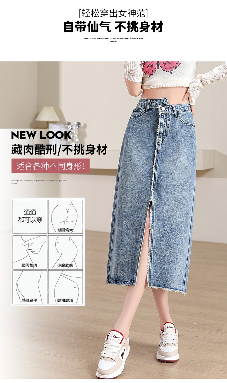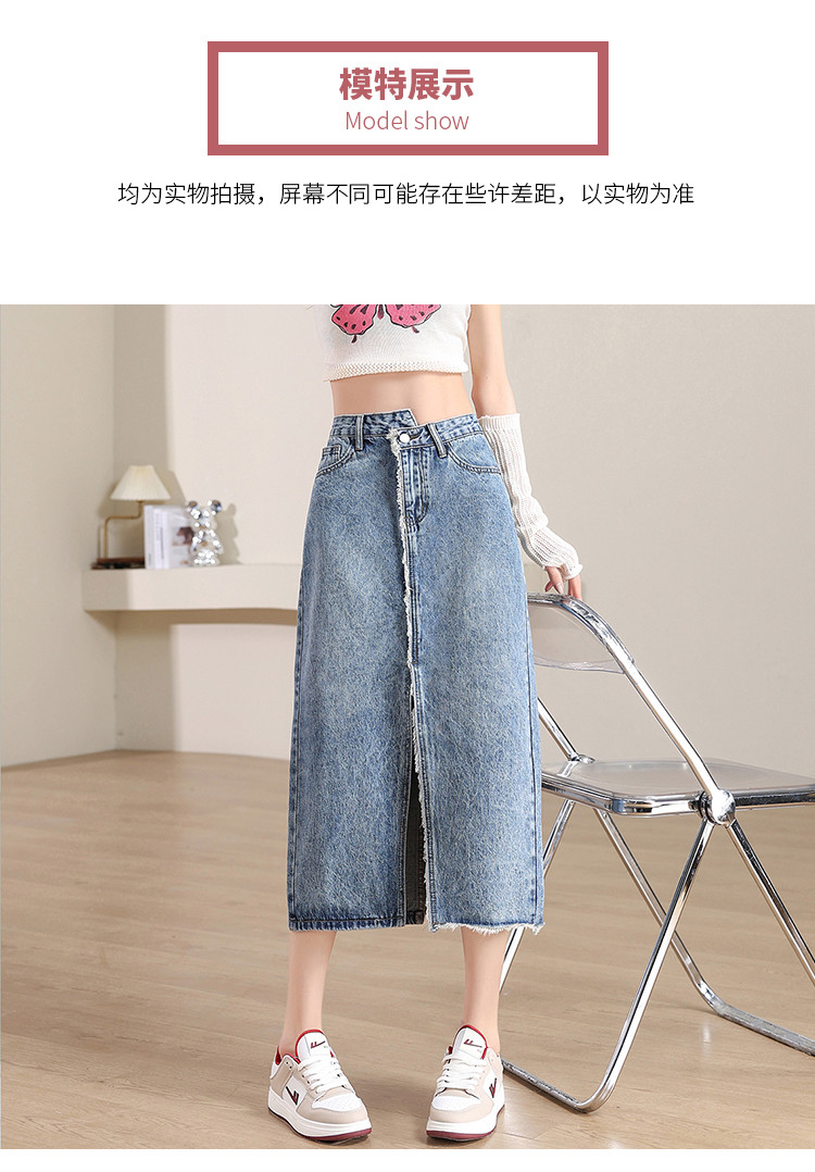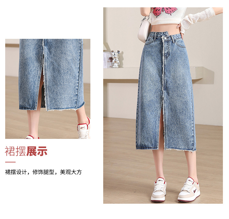 商品名称:高腰毛边不规则牛仔裙女春夏款裙子女开叉半身裙中长裙女 690059