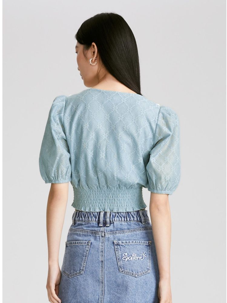 【蕾丝娃娃领】春夏专柜款夏优雅甜美泡泡袖五分袖雪纺衫女百搭 995473