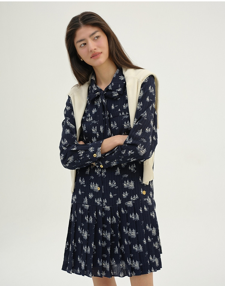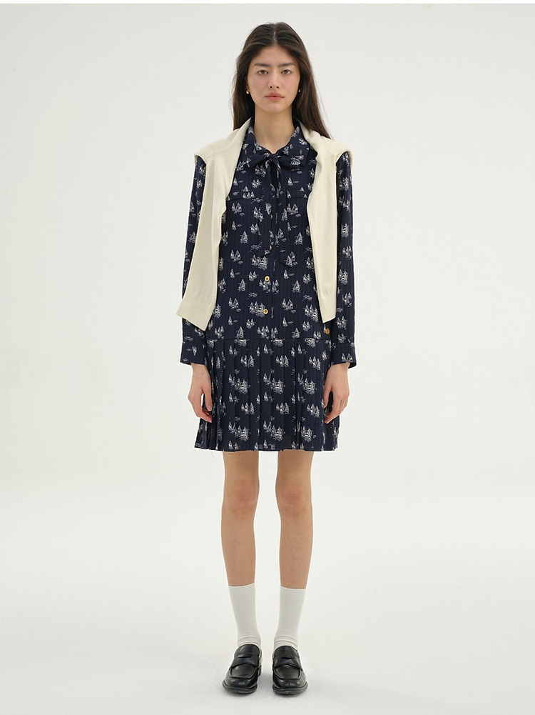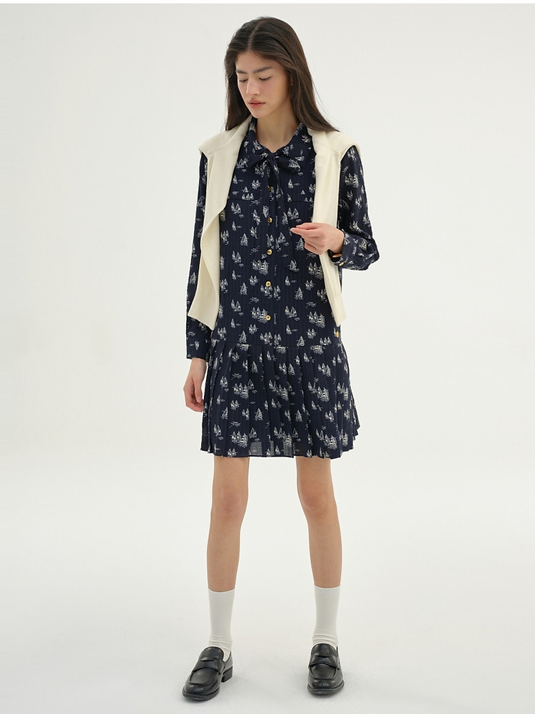 雪纺连衣裙女夏季百褶满印长袖连衣裙短裙女 384833