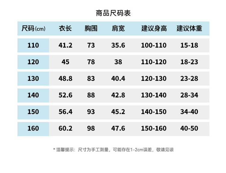 | 尺码 | 衣长(cm) | 肩宽(cm) | 身高(cm) | 适合年龄 | 胸围(cm) | 号型 |