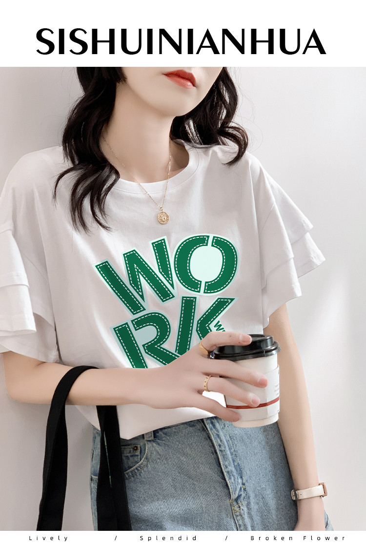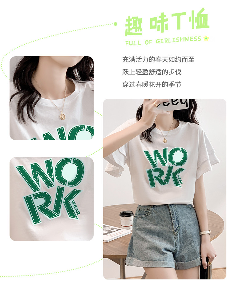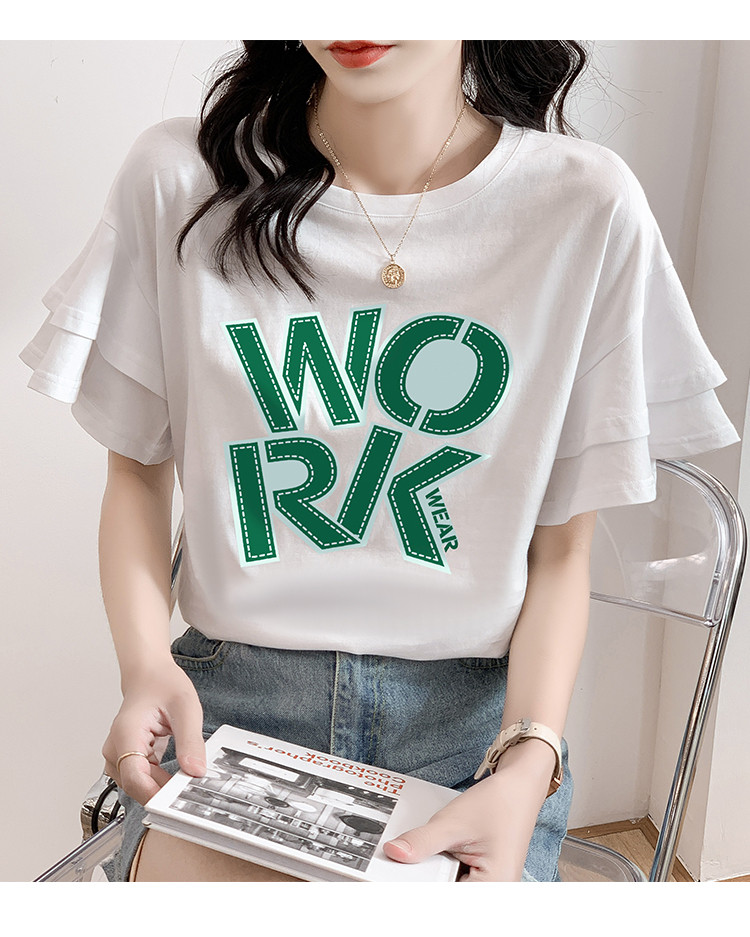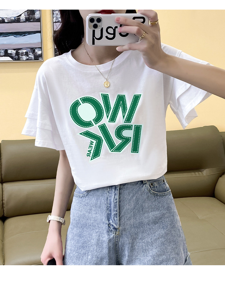 【100%棉短袖】夏季别致袖子圆领t袖时尚字母印花百搭上衣女 126232