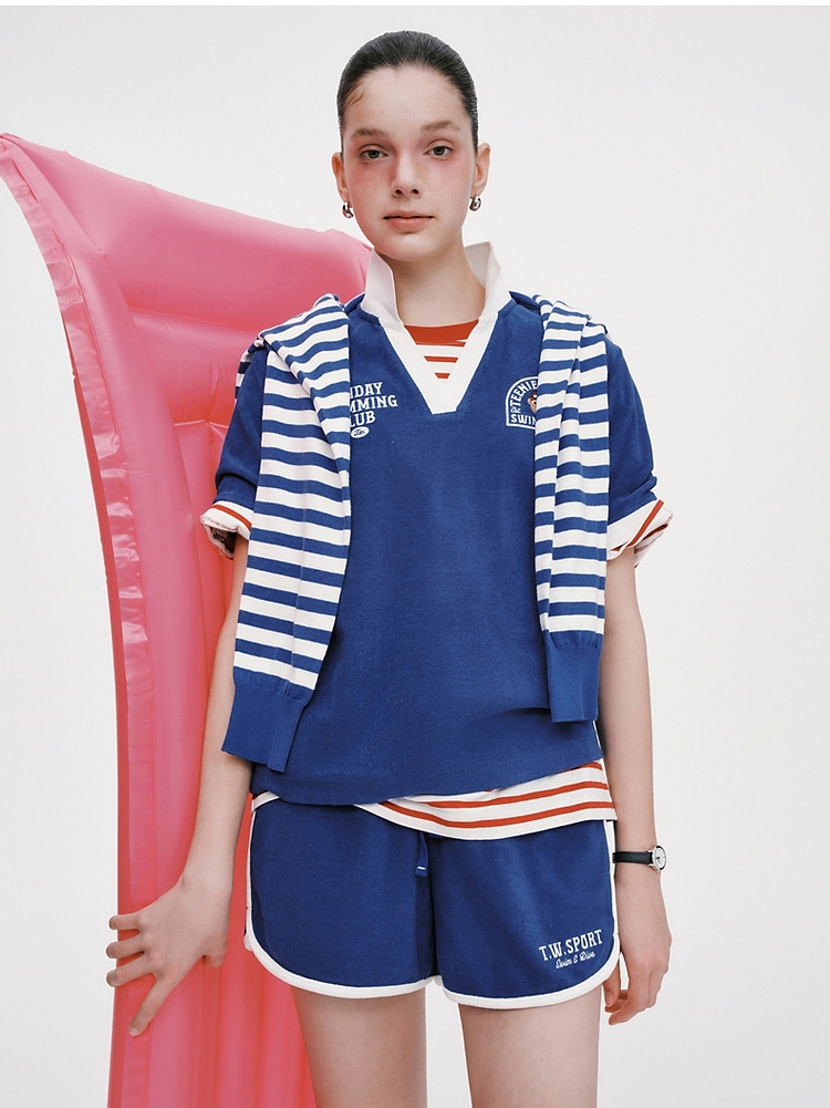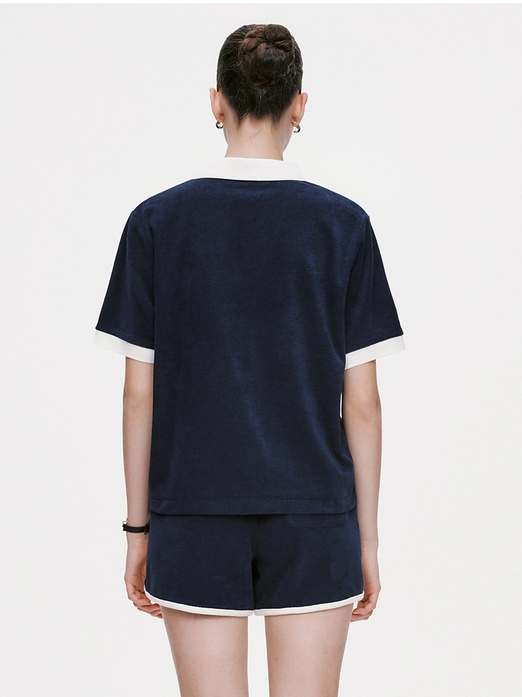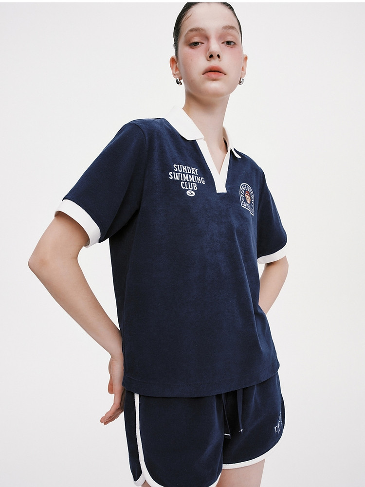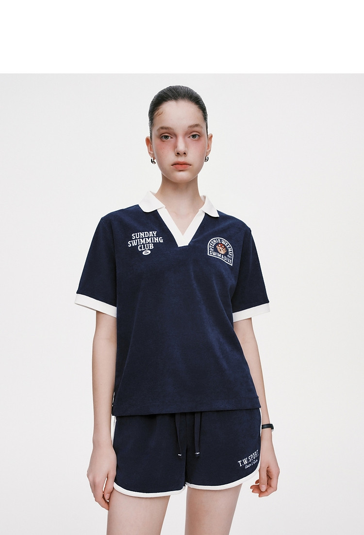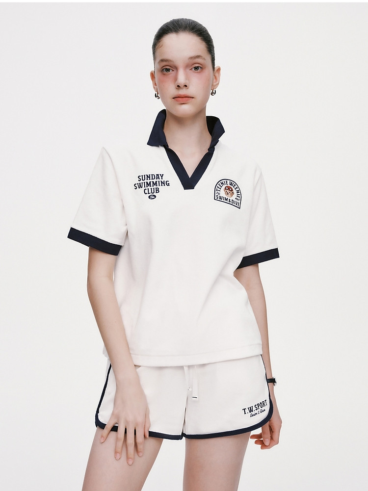小熊毛巾布软糯Polo领短袖T恤衫宽松慵懒上衣 044353