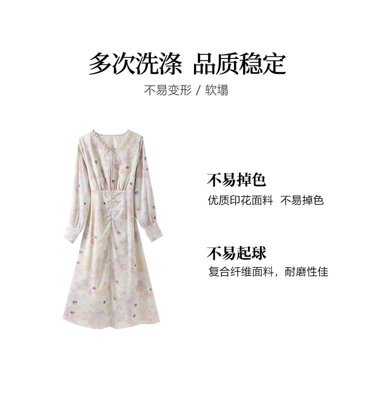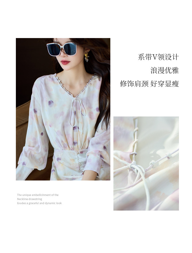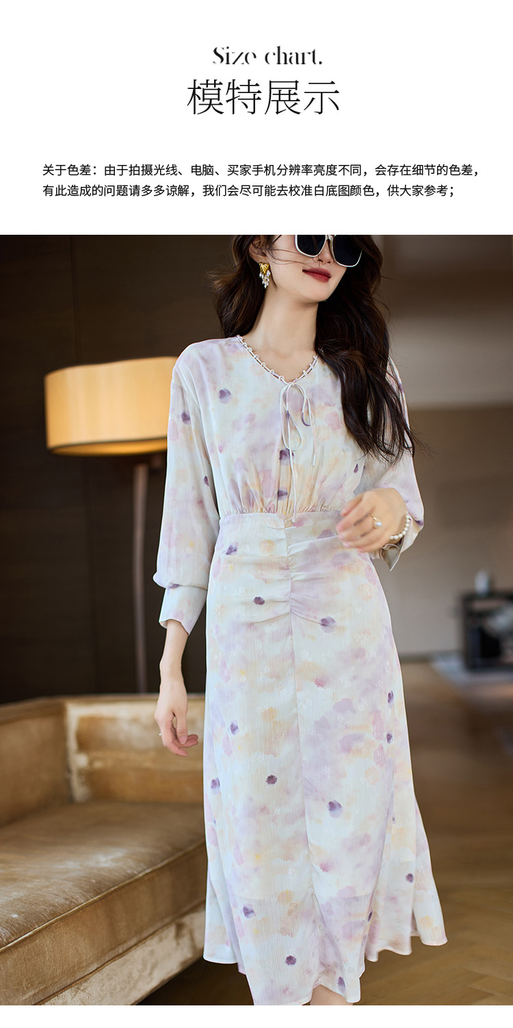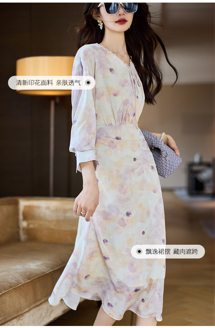 商品名称:国风水墨画连衣裙2025春夏新款气质绑带抽皱收腰中长款裙子女 673033
