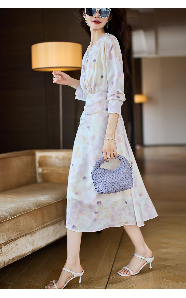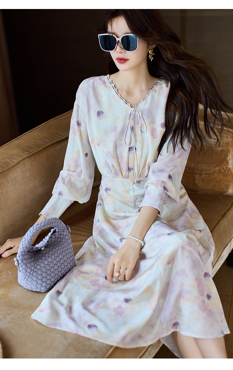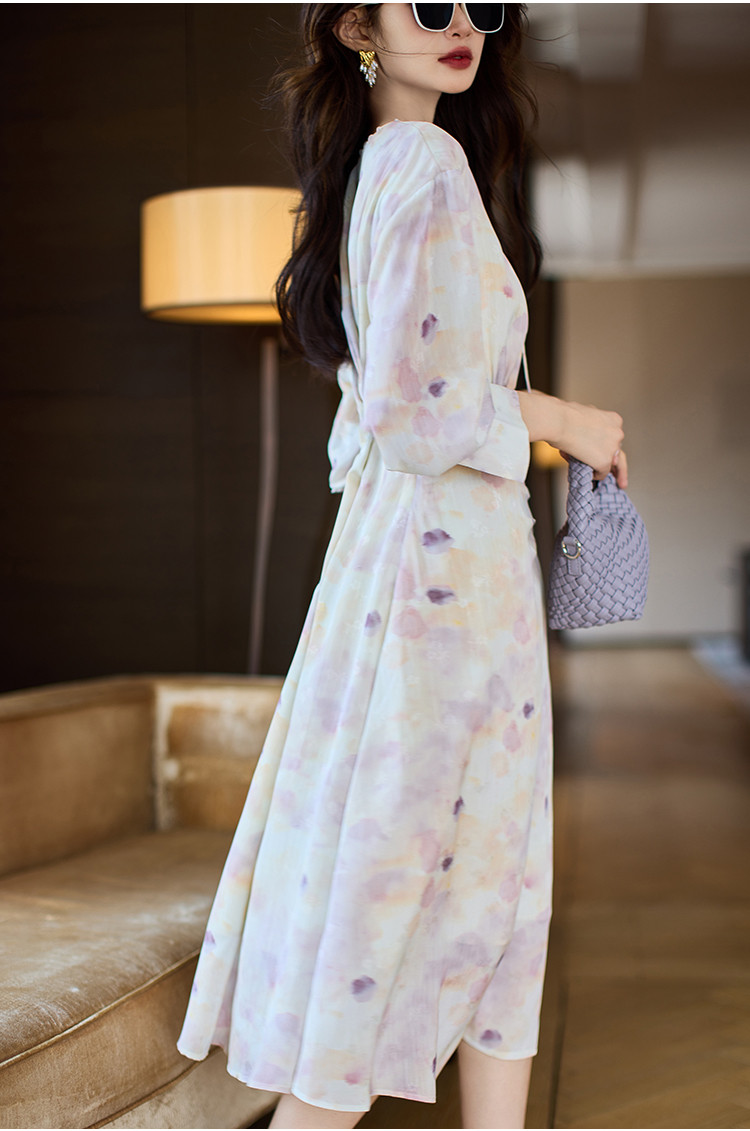 国风水墨画连衣裙2025春夏新款气质绑带抽皱收腰中长款裙子女 673033
